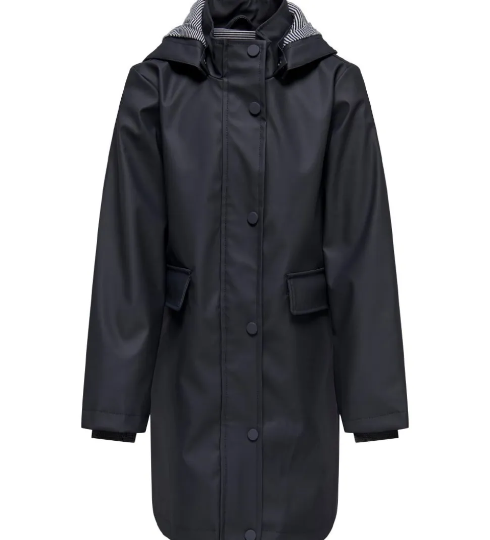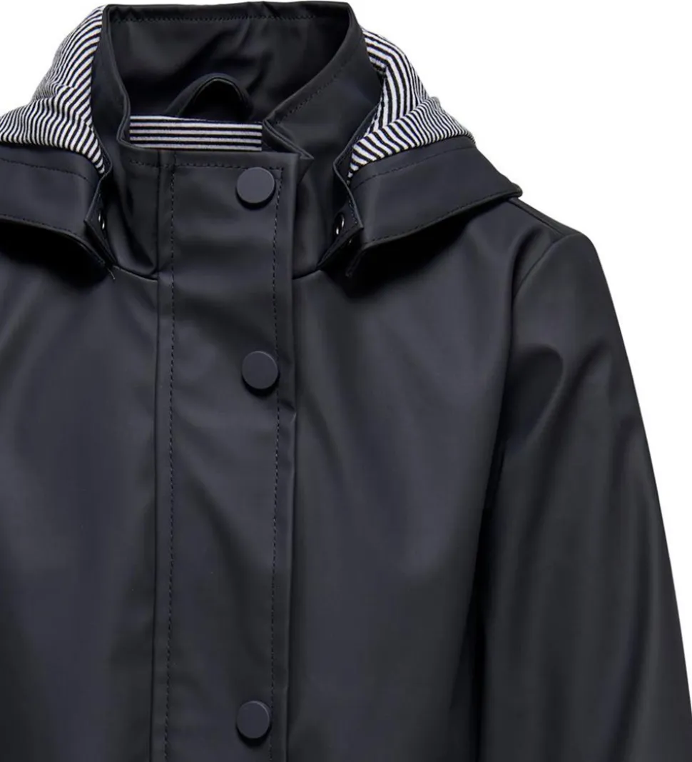 Kids Only regnjakken har en aftagelig hætte, der fæstnes med trykknapper langs den høje halskrave. Regnjakken har lange ærmer med vindfang og brede ribkanter i åbningerne.