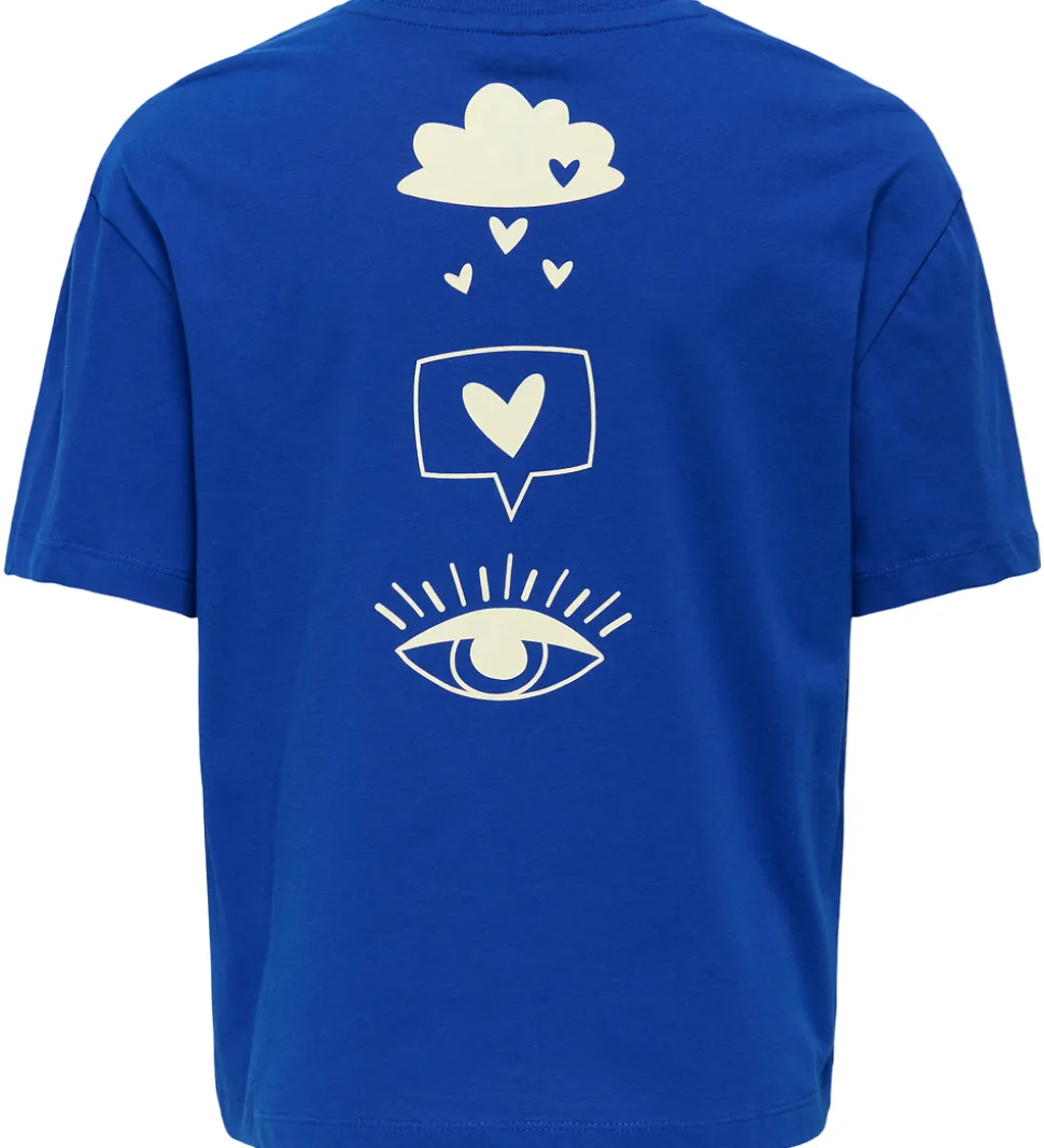 Smart Kids Only t-shirt i en klar blå farve med teksten “Loved By Me” og et hjerte på brystet. På ryggen er der et hvidt print af en sky, en hjerte-besked og et øje. Kids Only t-shirten er designet med korte ærmer og en rund halsudskæring med en fin ribkant, som skaber en moderne og afslappet stil.