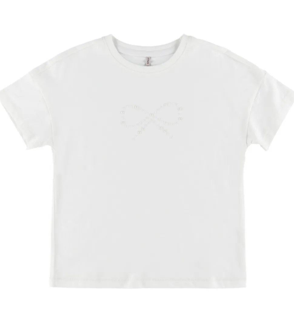 Elegant t-shirt fra Kids Only i en klassisk hvid farve. T-shirten har et diskret og fint mønster af en sløjfe på forsiden, lavet med små, stilfulde perler. Den har en rund halsudskæring med en smal ribkant, som giver et minimalistisk touch. T-shirten har korte ærmer og en lige, løs pasform.