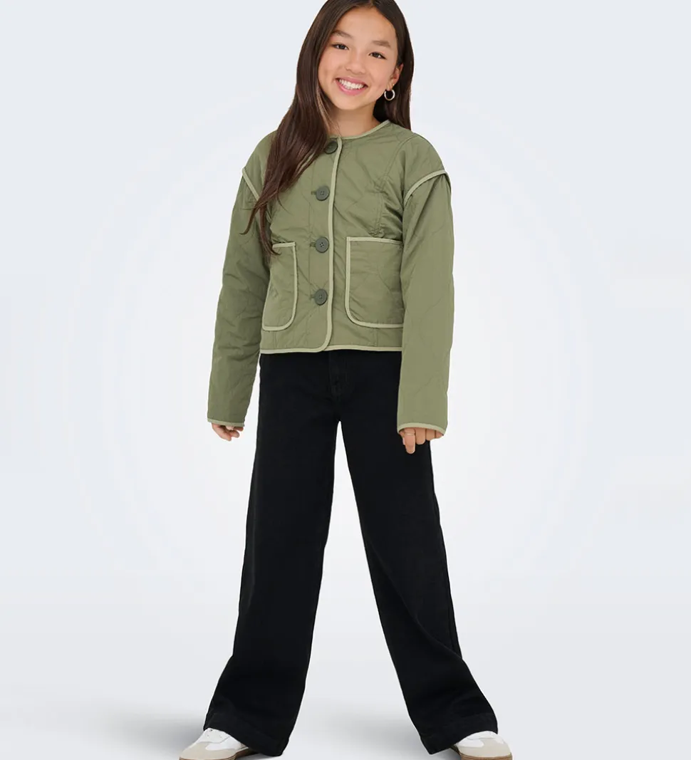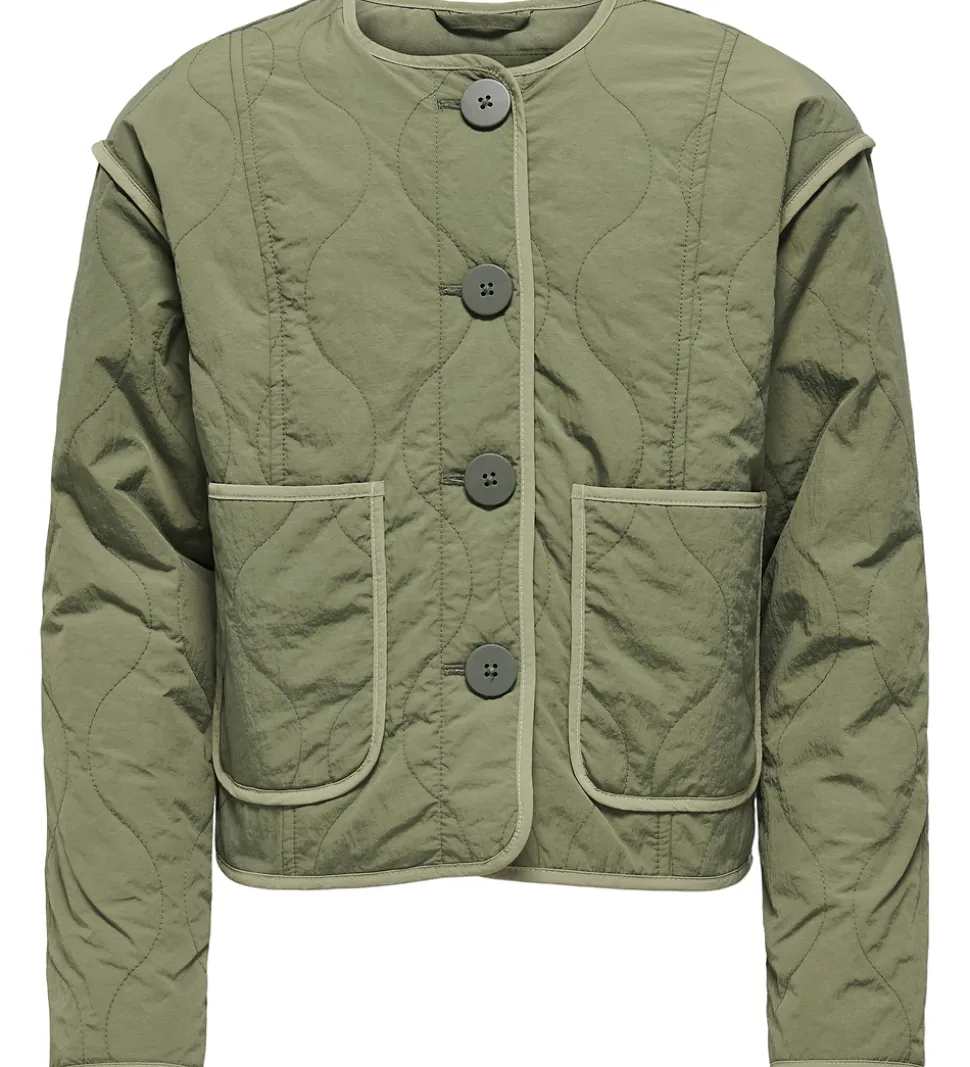 Flot Kids Only termojakke i olivengrøn med quiltet struktur og kanter i en lysere grøn nuance. Termojakken har en rund halsudskæring og lange ærmer. Den lukkes fortil med gennemgående knapper, og har en stor lomme i hver side. Termojakken har en let vattering og glat for indvendigt.
