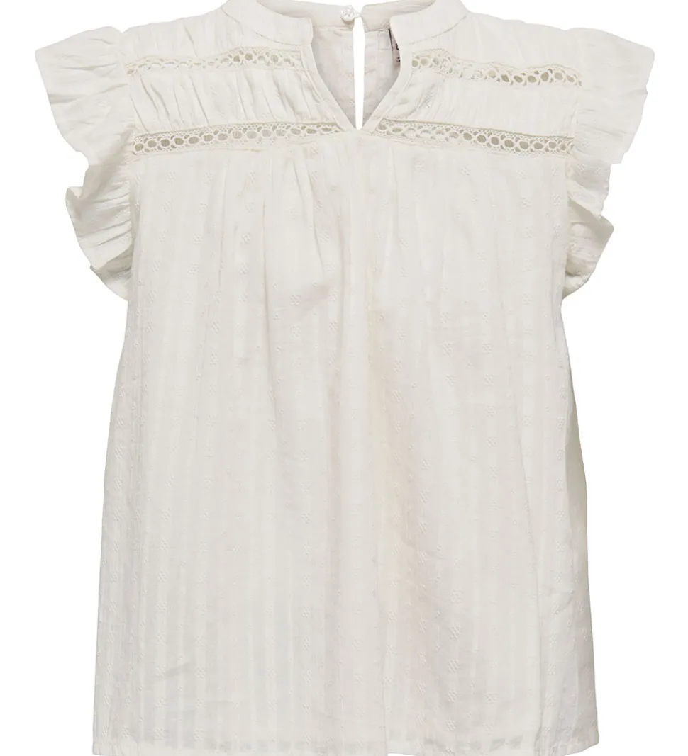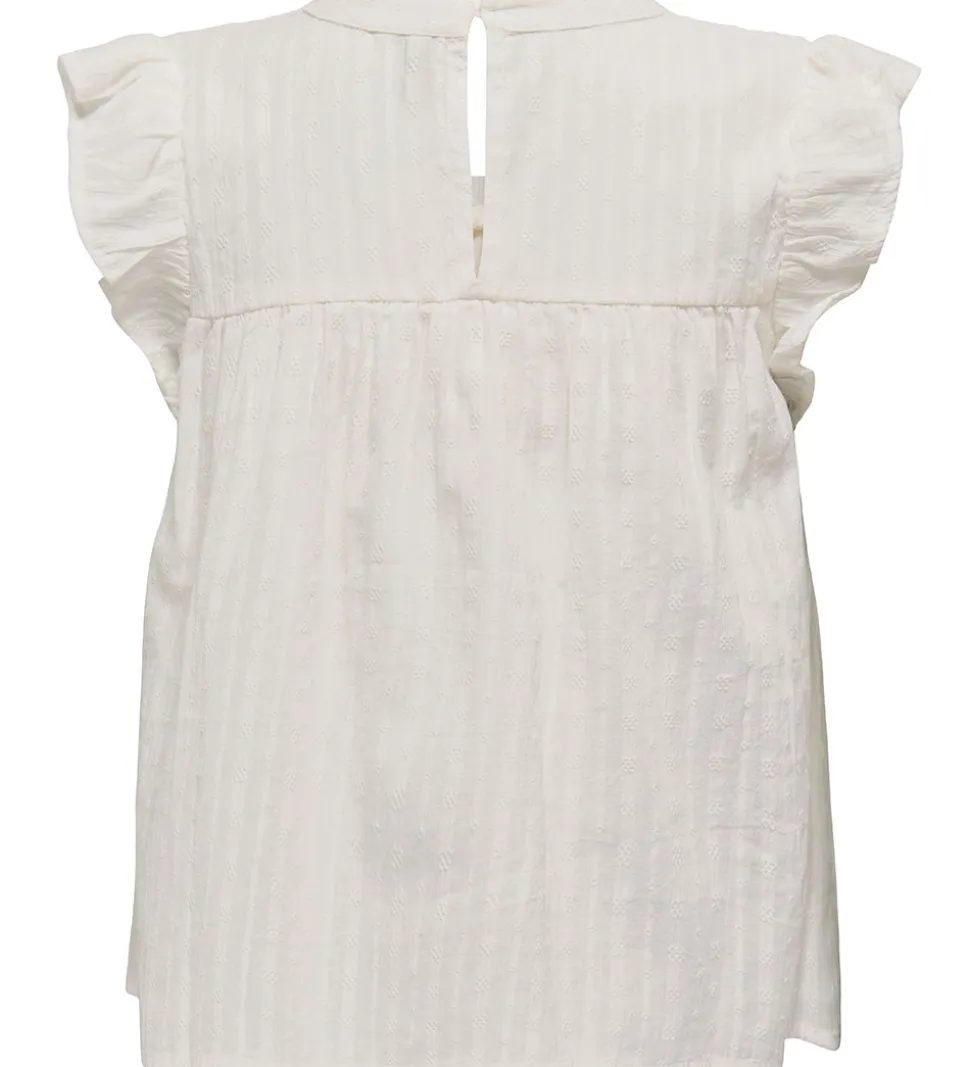 Skøn Top fra Kids Only i hvid med fine flæser ved ærmerne. Toppen har et delikat mønster, der tilføjer en smule flair til det enkle design. Perfekt til en afslappet dag.