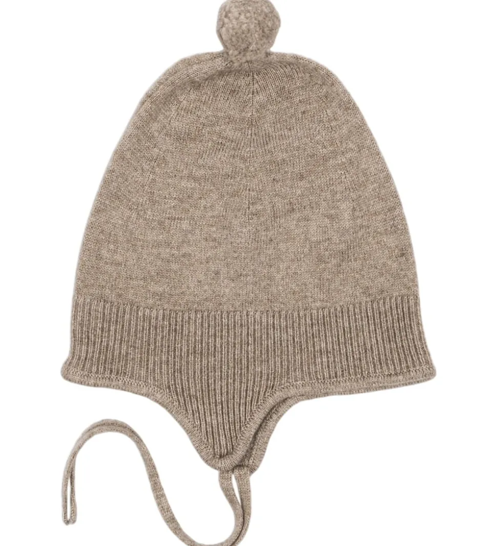 Elegant Konges Sløjd babyhjelm strikket i en varm, lysebrun nuance.