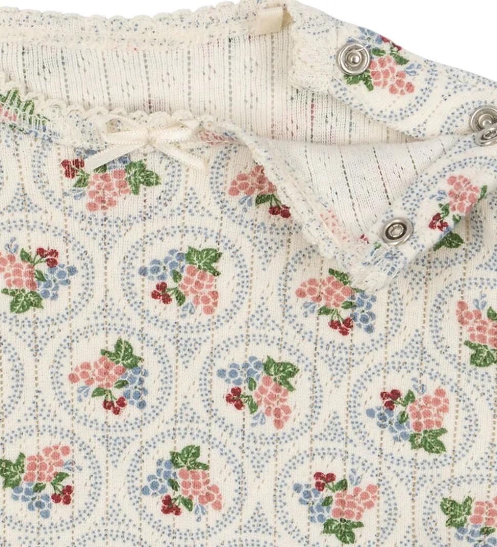 Elegant Konges Sløjd body i hvid med et delikat blomstermønster i blå og rosa nuancer. Bodyen har lange ærmer og en rund halsudskæring.