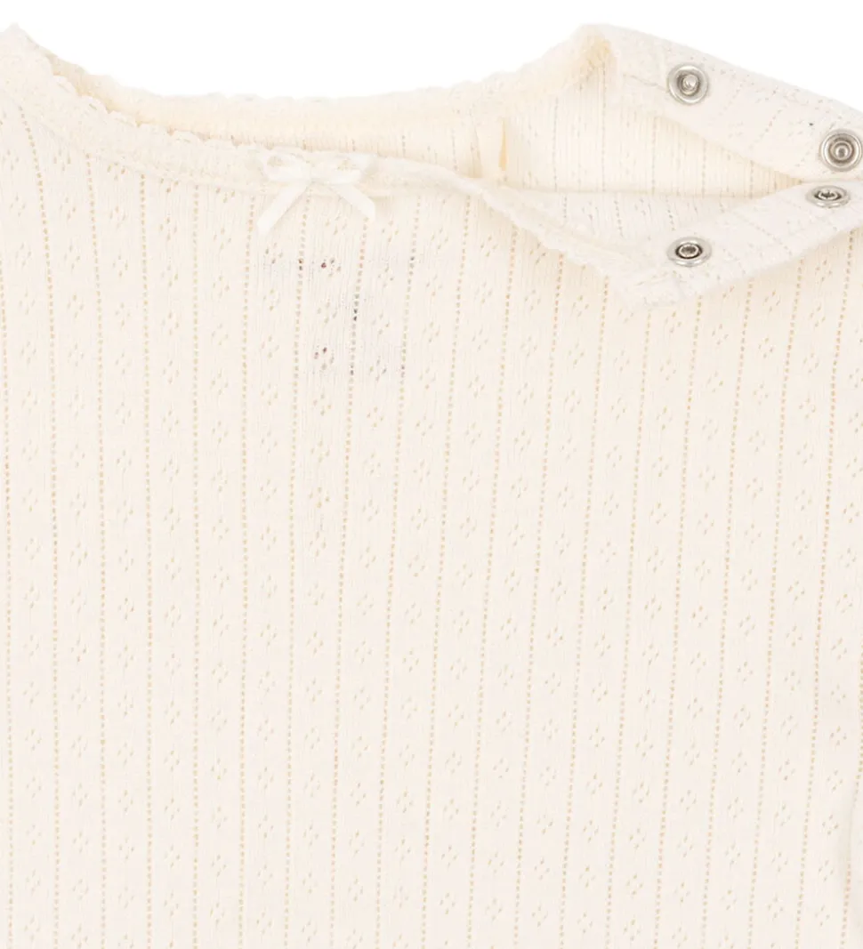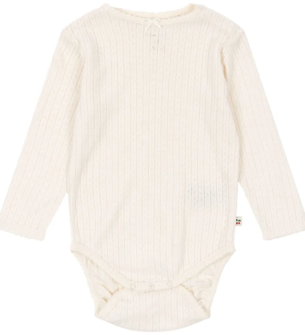 Fin Konges Sløjd body i en lys cremefarve. Den langeærmede body har et elegant hulmønster med ribstruktur, der giver et stilrent udtryk.