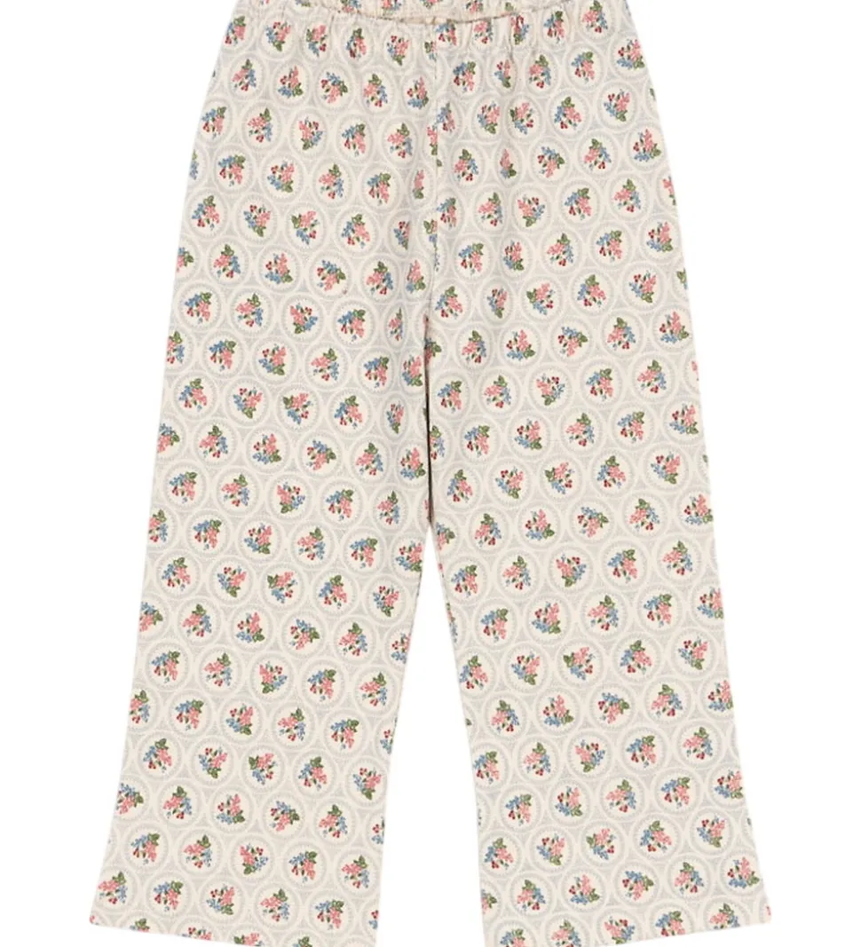 Smukke bukser fra Konges Sløjd i cremehvid med et delikat blomstermønster i røde, blå og grønne nuancer.