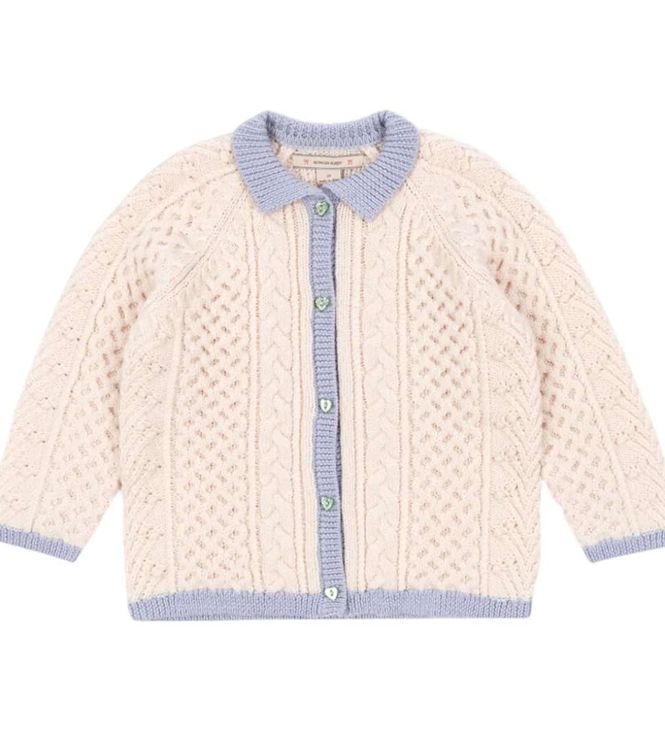 Cardiganen fra Konges Sløjd er designet med en flot kontrastfarve i lyseblå ved krave, knaplukning og kanter. De lange ærmer og de små hjerteformede knapper tilføjer en særlig detalje til cardiganen.