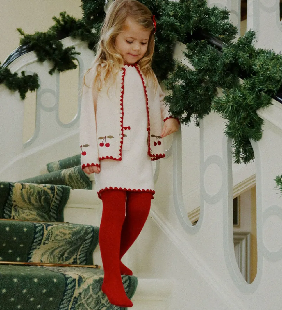 Skøn Konges Sløjd cardigan i creme med et pudderrosa skær med delikate kirsebærbroderier langs kanten fortil og yderst på ærmerne. Cardiganen har lange ærmer og en flot zigzag-kant i rød langs knaplukningen og nederst ved ærmerne. Konges Sløjd cardiganen lukkes med knapper, og den er lavet i en blød, strikket uldkvalitet.