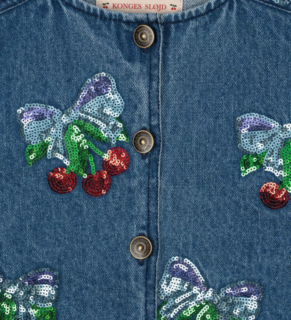 Elegant Konges Sløjd denimjakke i en klassisk, blå denimnuance med smukke pailletbroderinger af sommerfugle og kirsebær i flere farver. Denimjakken er designet med rund halsudskæring og har en række dekorative knapper i midten.