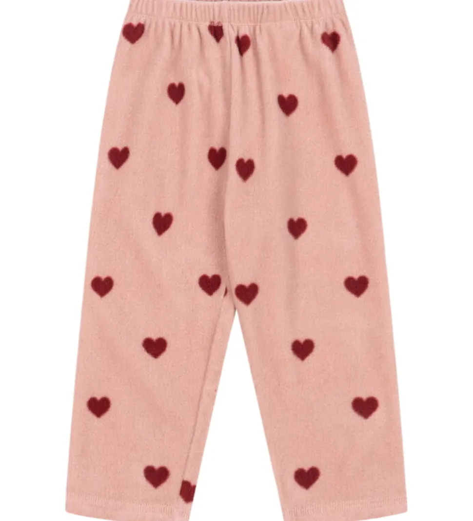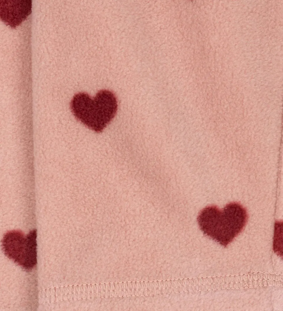 Praktiske Konges Sløjd fleecebukser i en smuk, lyserød farve prydet af røde hjerter.