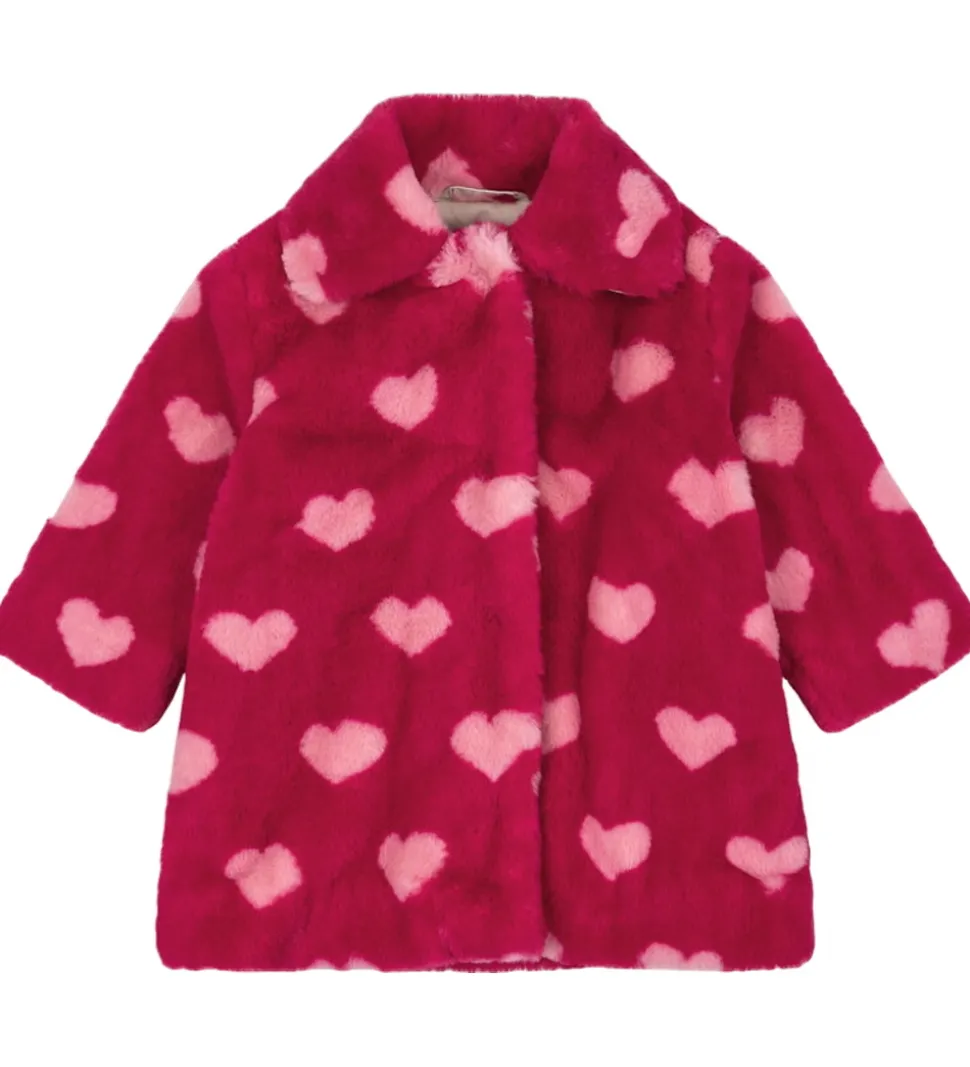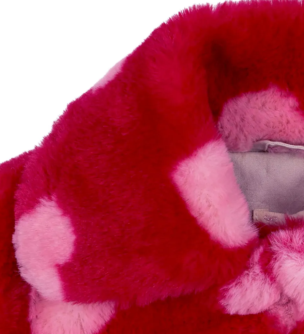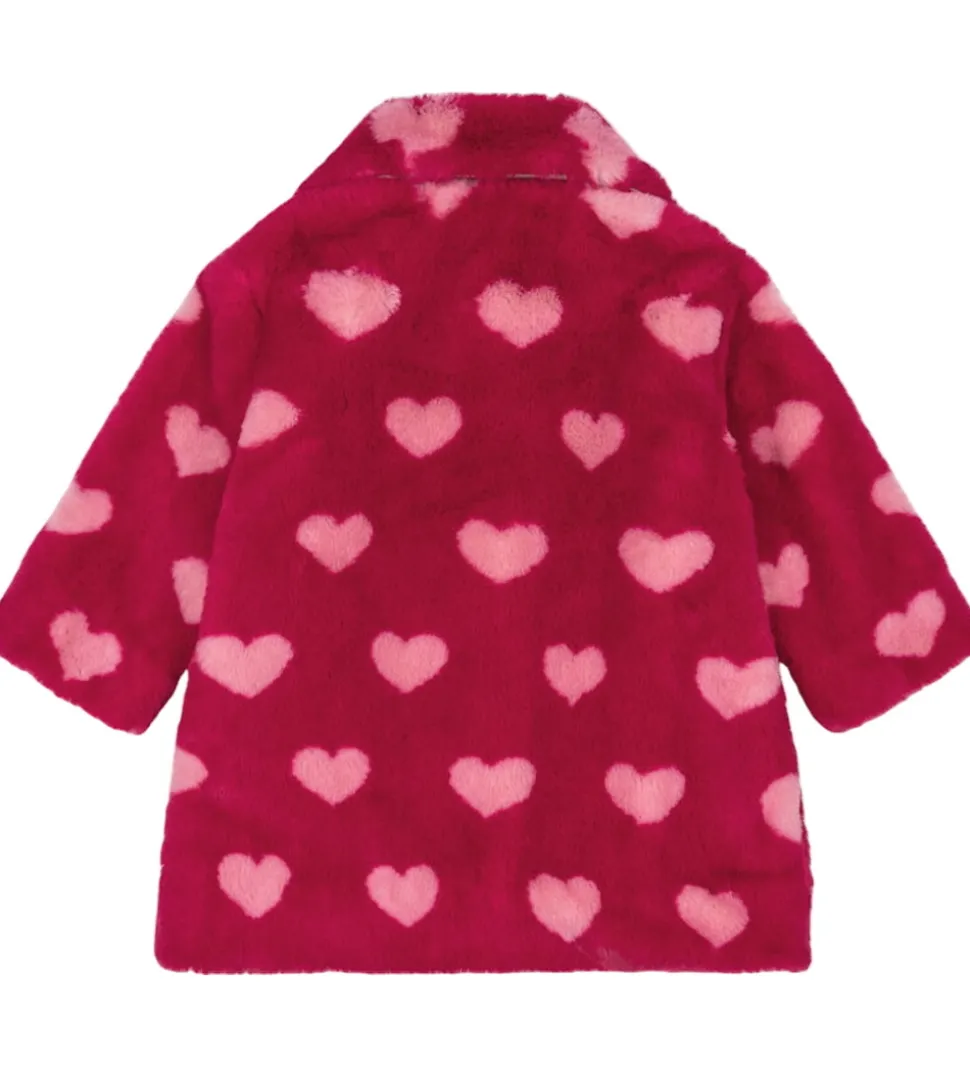 Smart Konges Sløjd fleecejakke i pink fleece, som ligner imiteret pels, og den har et alloverprint med rosa hjerter.