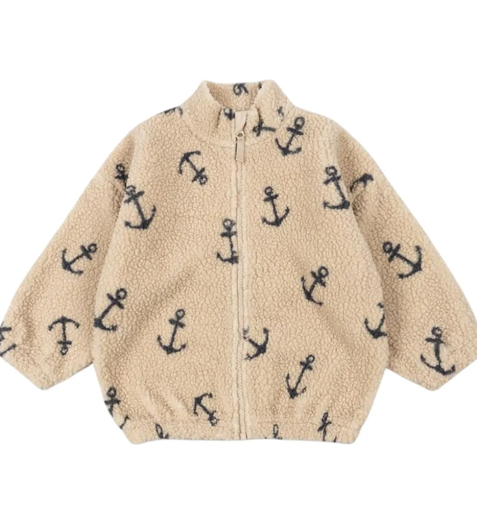 Lækker Konges Sløjd fleecejakke i beige teddyfleece, og med et alloverprint af ankre i mørkeblå.