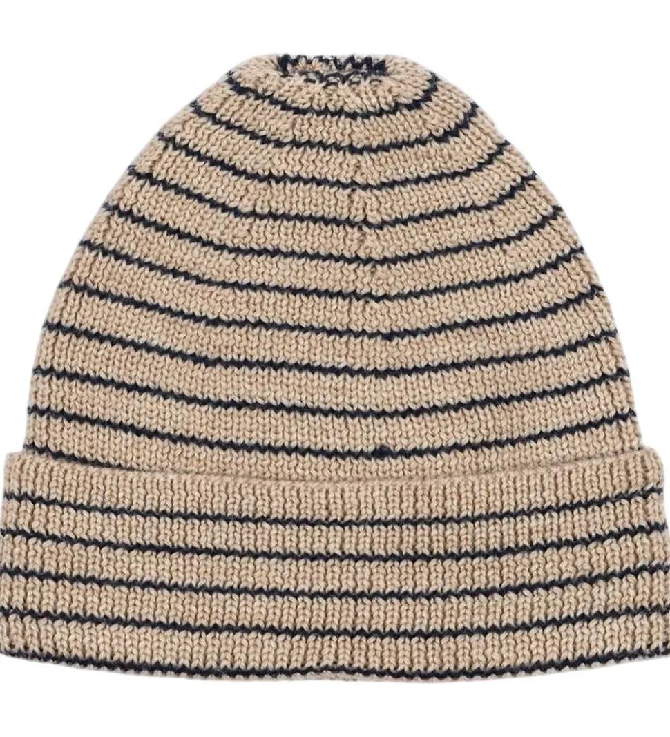 Elegant Konges Sløjd hue med en rund hovedform i beige med smalle, navy striber. Konges Sløjd huen har et bredt ombuk langs kanten, og den består af et enkelt lag i en blød strikket merinould.