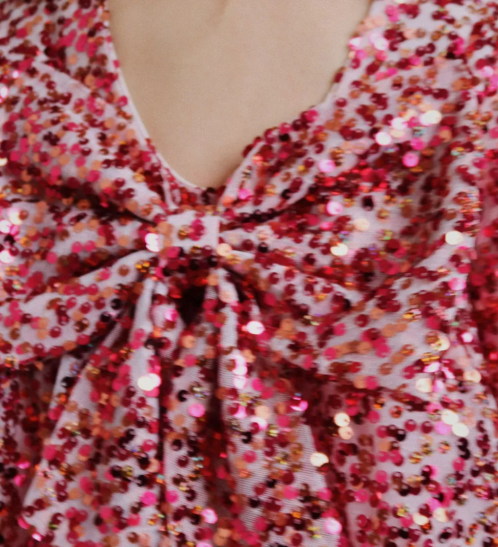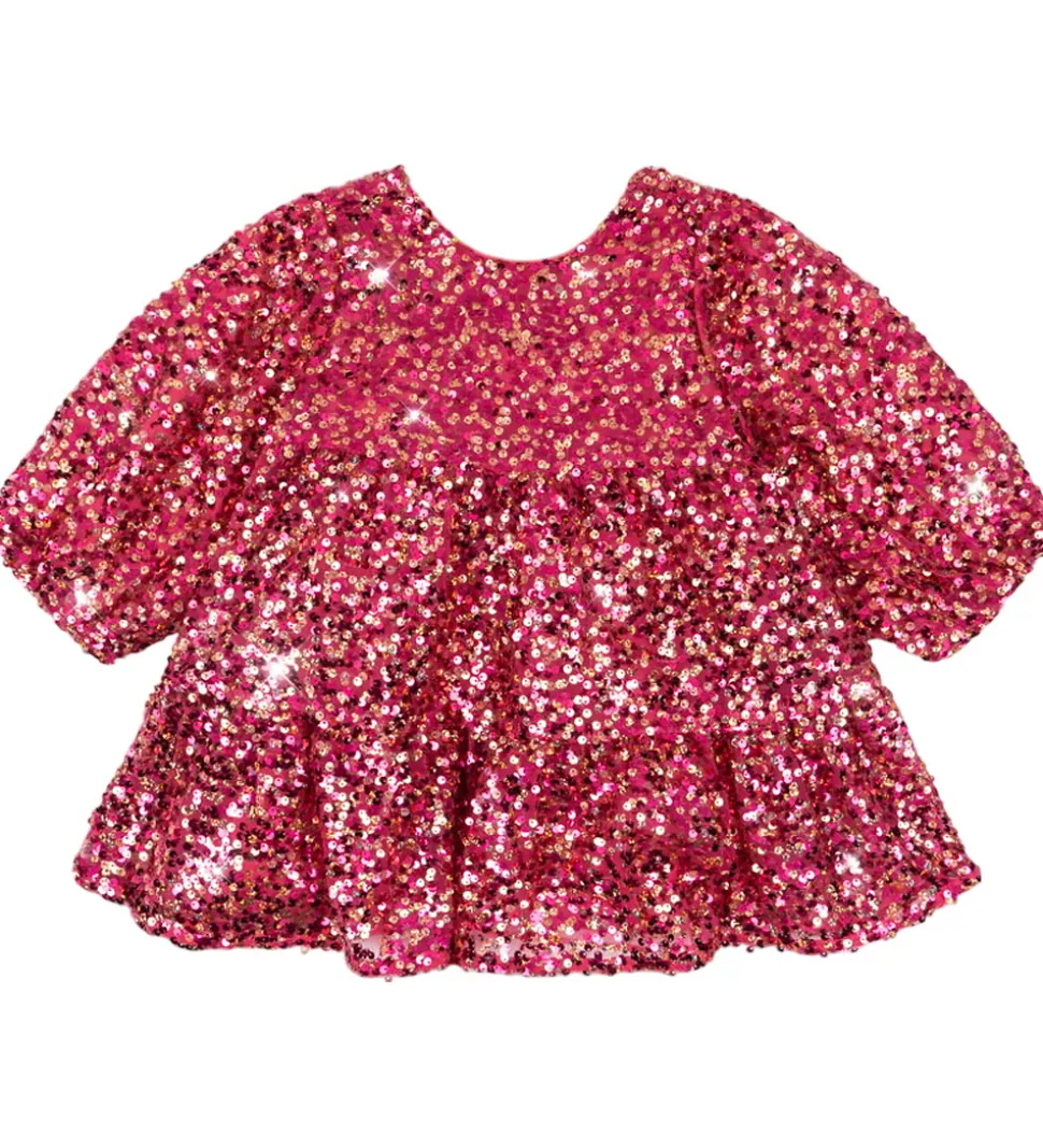 Festlig Konges Sløjd kjole prydet med skinnende, rosa pailletter. Denne Konges Sløjd kjole har lange pufærmer og en rund halsudskæring. Kjolen har en nedringet ryg med en fin sløjfeapplikation.