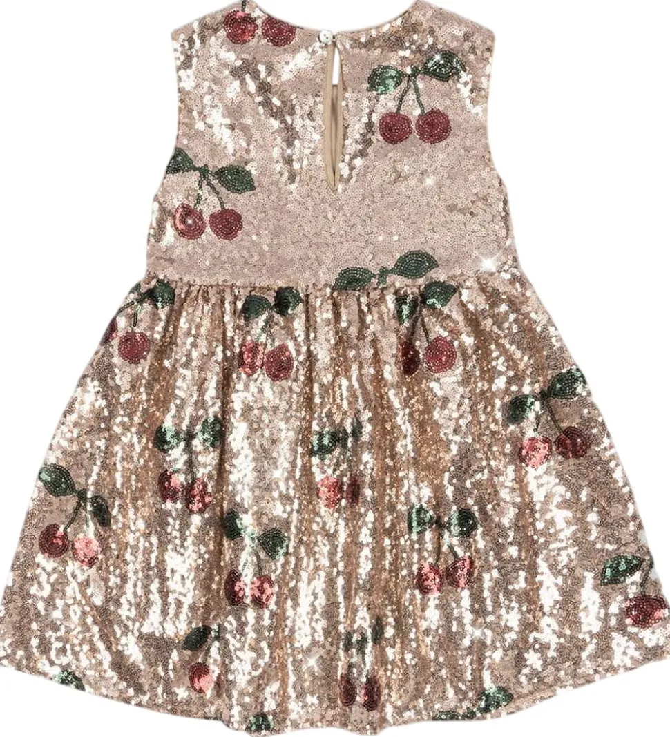 Fortryllende Konges Sløjd kjole med et strålende pailletdesign i rosa. Kjolen har et smukt kirsebærmønster i røde og grønne nuancer, der komplimenterer den gyldne baggrund. Konges Sløjds kjole har en ærmeløs struktur med rund halsudskæring.