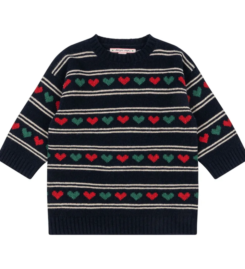 Indtagende Konges Sløjd kjole i navy med et stribet mønster i hvid og med røde og grønne hjerter. Konges Sløjd kjolen har ribkanter ved hals og ærmer, hvilket fuldender designet. Kjolen er lavet i en strikket kvalitet i en blød og lun uldblanding.