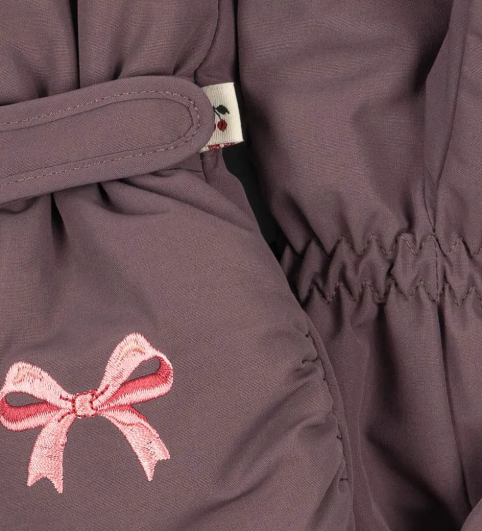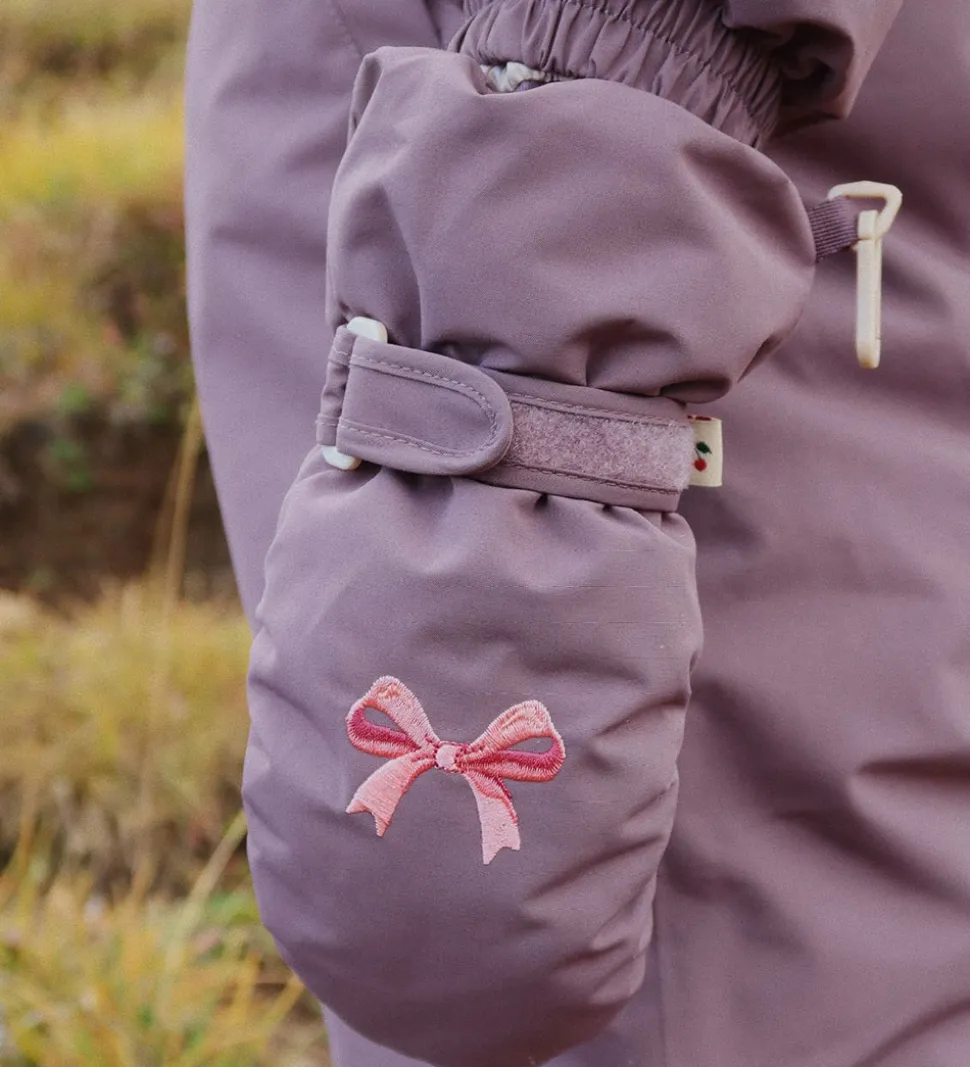 Fine Konges Sløjd luffer i en støvet lilla med en lille sløjfe broderet på toppen. Konges Sløjd lufferne er godt vatteret og har en elastikkant ved åbningerne der holder kulde og vind ude, samt en velcrorem ved håndleddene så de kan strammes godt ind.