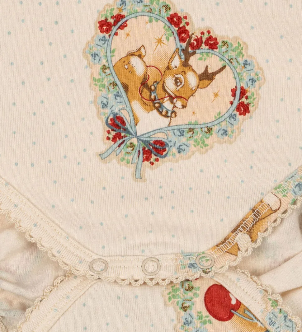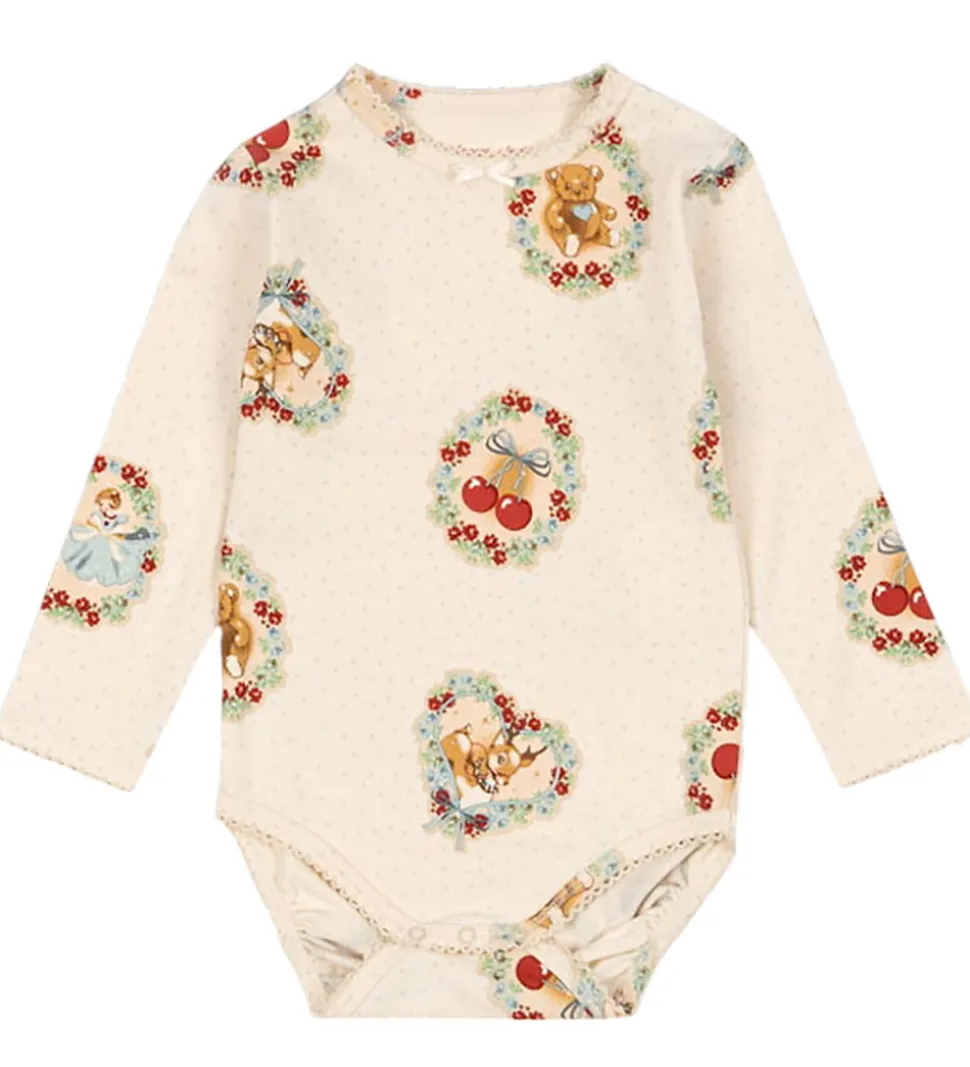 Charmerende Konges Sløjd sæt betående af en body og et par leggings. Sættet er beige med et sødt print med bamser og kirsebær indrammet af blomster i forskellige nuancer.