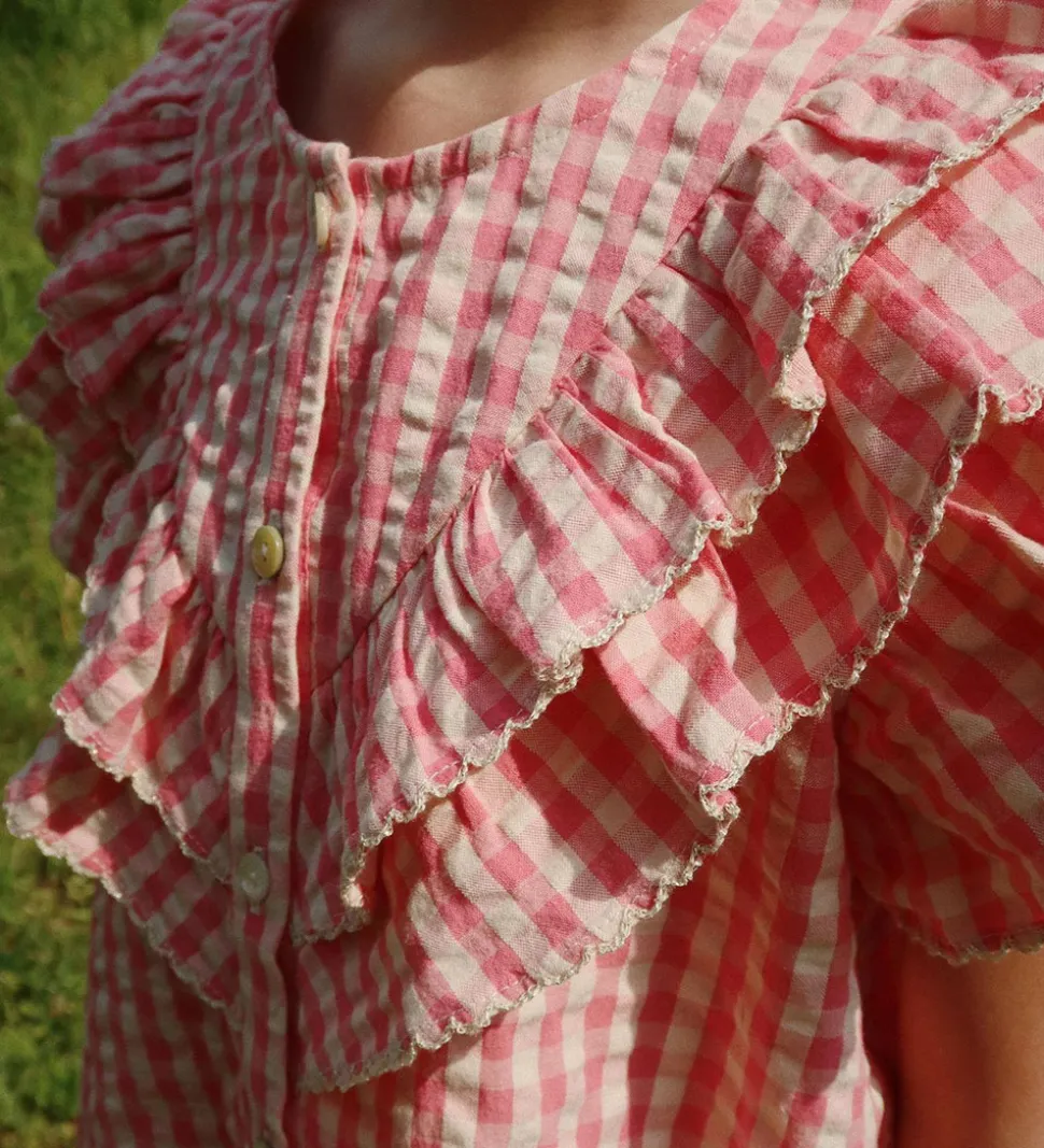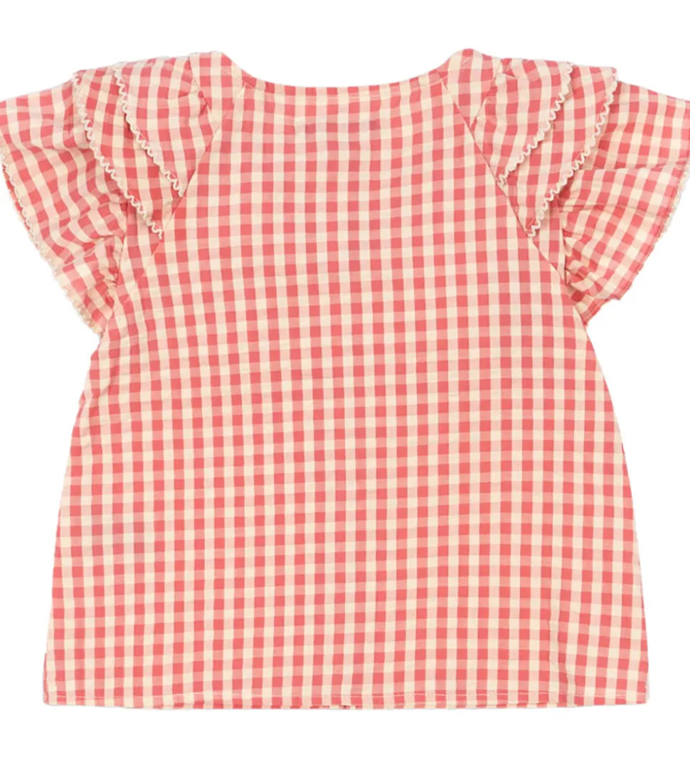 Skøn Konges Sløjd skjorte med korte ærmer i rosa og beige med ternet mønster og en dekorativ flæsekant fortil. Skjorten har gennemgående knapper fortil og er fremstillet i en let bomuldskvalitet.