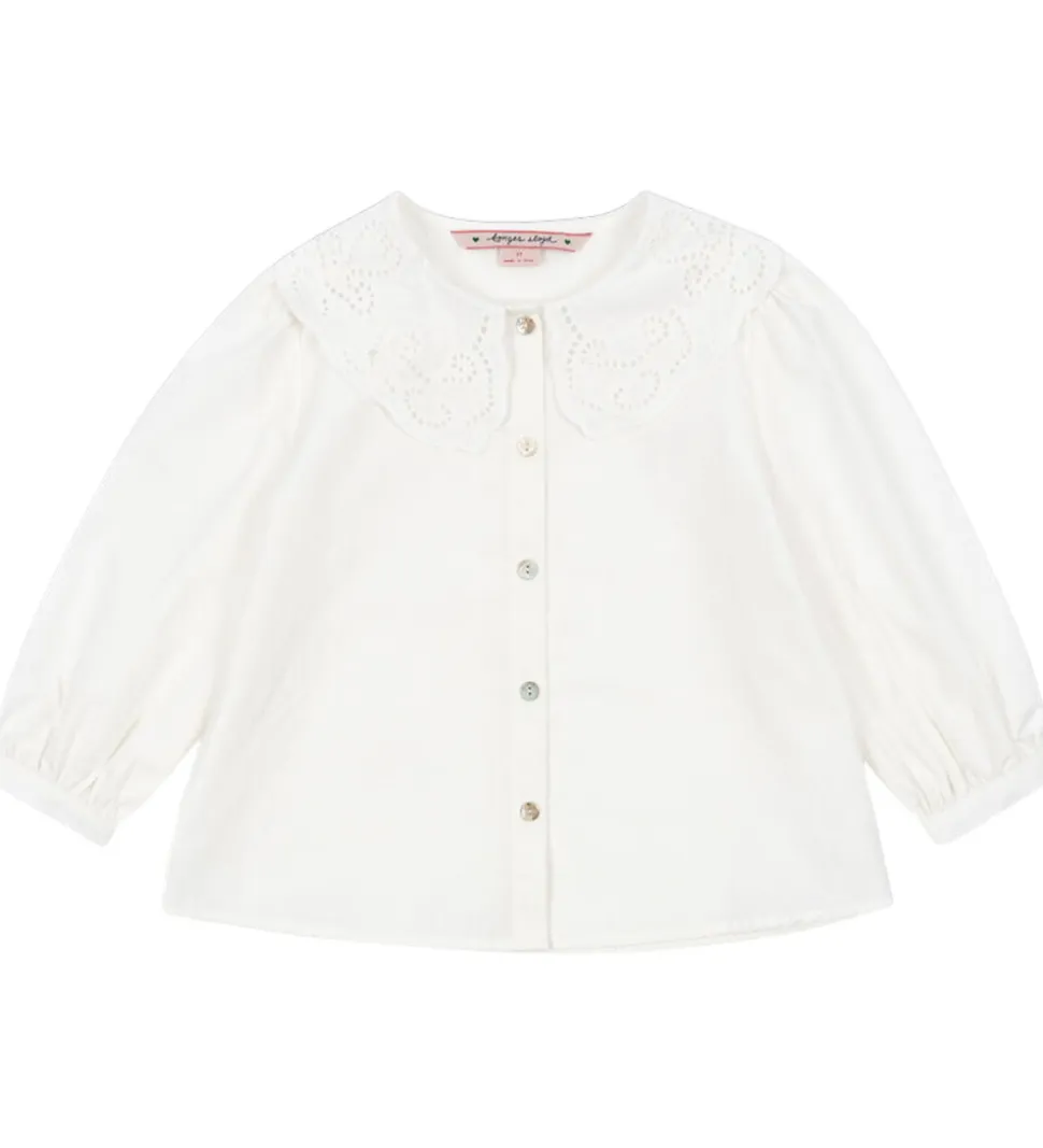 Elegant Konges Sløjd skjorte i en delikat, hvid nuance. Skjorten har en smuk, broderet krave. Konges Sløjd skjorten har knapper langs fronten og lange ærmer med en let elastik ved håndleddene. Pasformen er løs og behagelig.