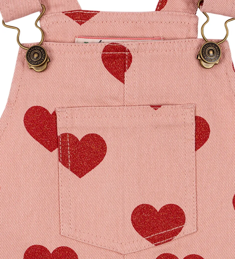 Charmerende Konges Sløjd spencer i lyserødt denim med røde hjerter med glimmer. Spenceren er lavet i en fastvævet kvalitet.