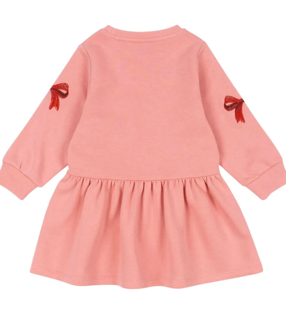 Elegant Konges Sløjd kjole i rosa sweat med dekorative sløjfer broderet fortil i røde nuancer. Konges Sløjd sweatkjolen har lange ærmer og brede ribkanter, der giver et klassisk look. Skørtet har en god vidde, der lægger sig i bløde folder. Sweatkjolen har blødt, børstet bomuld på indersiden.