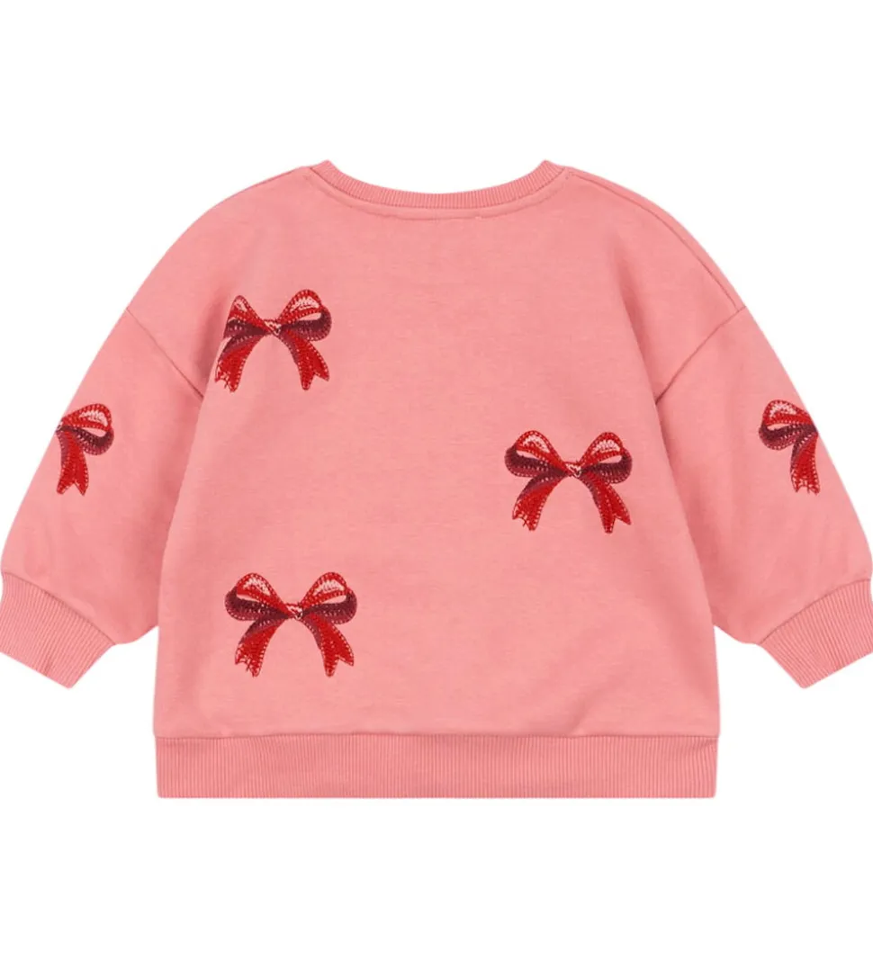 Elegant sweatshirt fra Konges Sløjd i en blød rosa nuance prydet med broderede sløjfer i rosa nuancer. Konges Sløjd sweatshirten har ribkanter ved håndled og halsudskæring samt broderet tekst på forsiden, der skaber et stilfuldt udtryk.