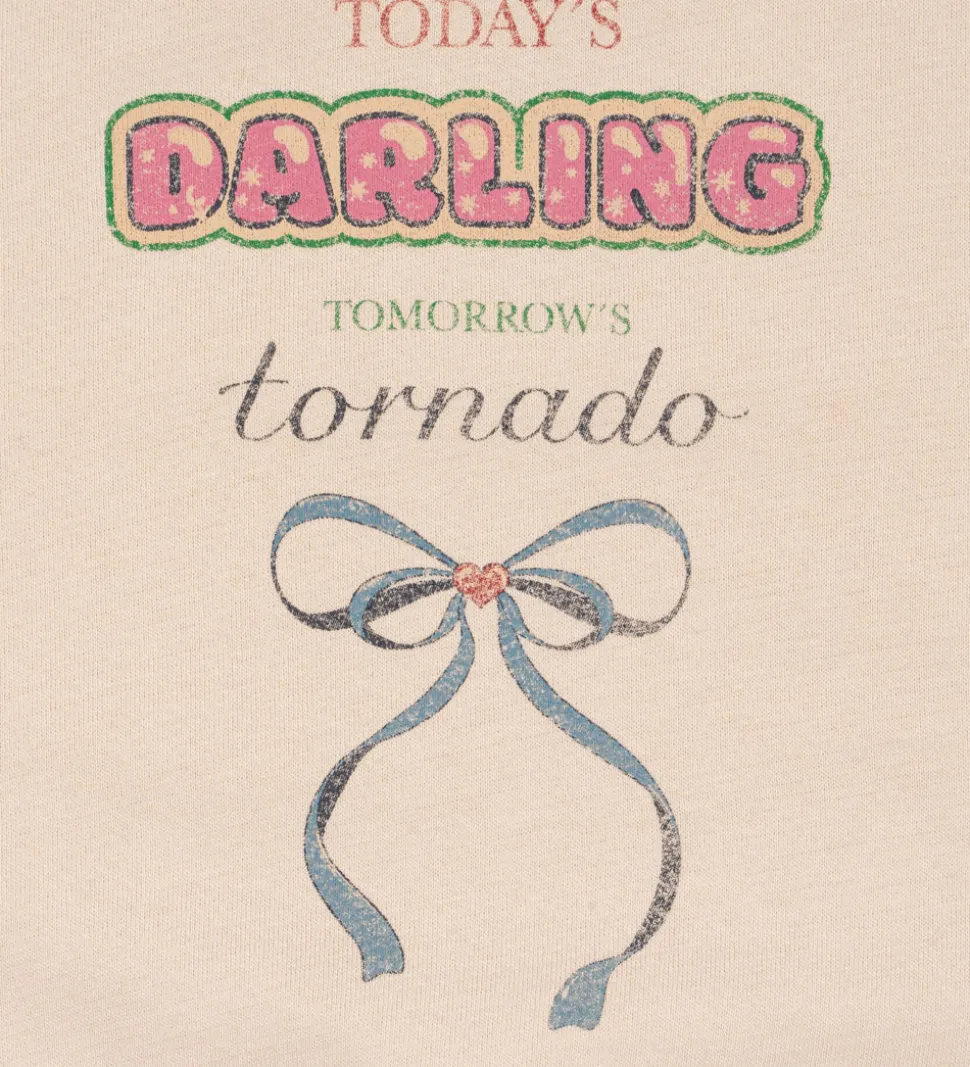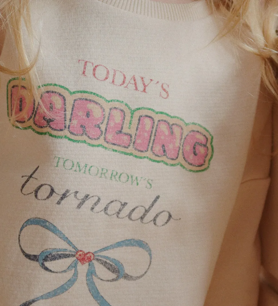 Sweatshirten har et unikt print med teksten “Today’s Darling Tomorrow’s Tornado” i farverige bogstaver, ledsaget af en detaljeret sløjfeillustration. De lange ærmer og ribkanter ved hals og håndled fuldender designet fra Konges Sløjd.
