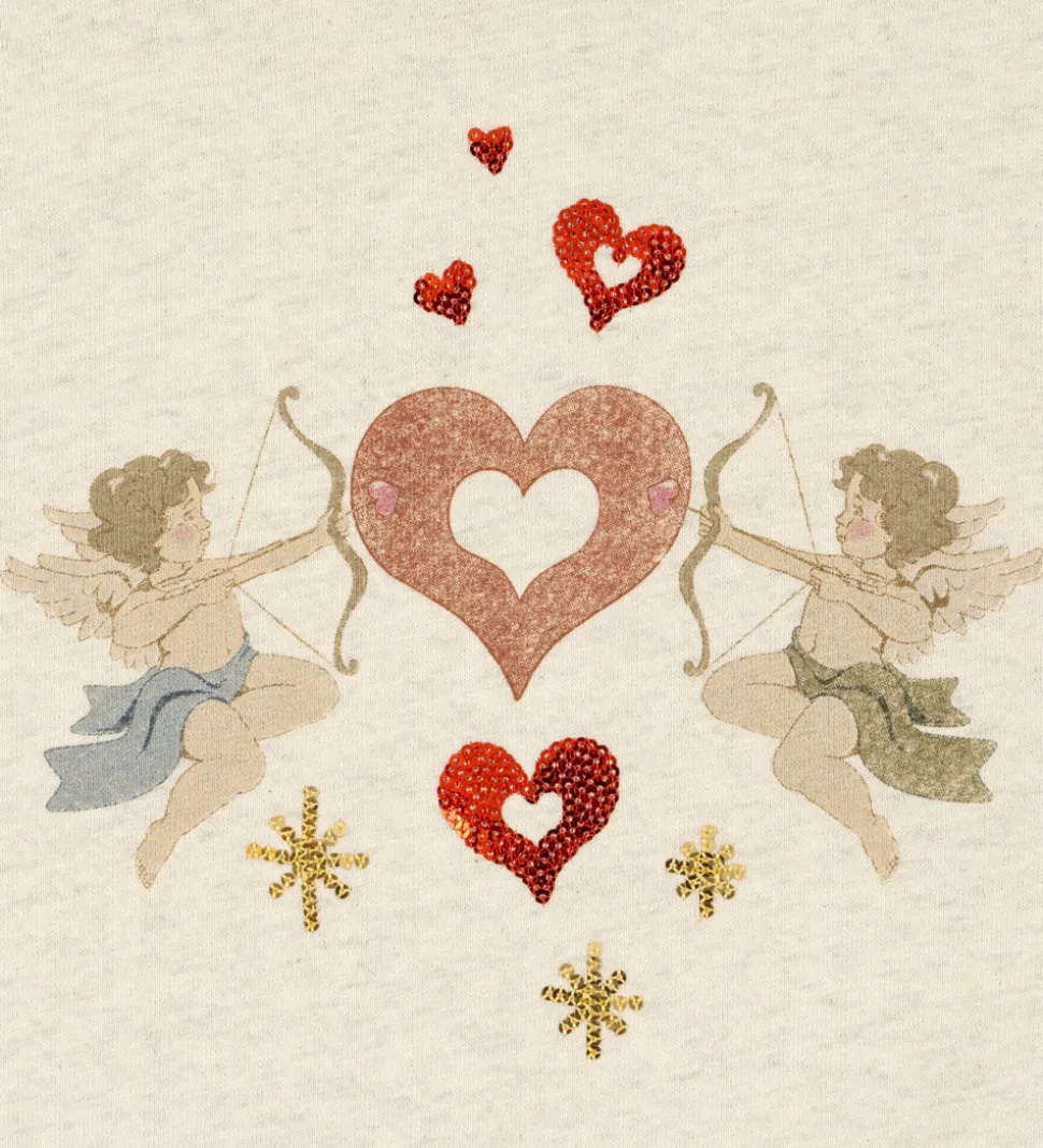 Skøn Konges Sløjd sweatshirt i en lys beige farve, og på ryggen er der et stort print med et rødt hjerte sammen med to englebørn, og printet er dekoreret med røde hjerter og guldfarvede stjerner lavet af pailletter. Konges Sløjd sweatshirten har lange ærmer og en rund halsudskæring samt ribkanter ved ærmer og bund, der giver et enkelt udtryk.