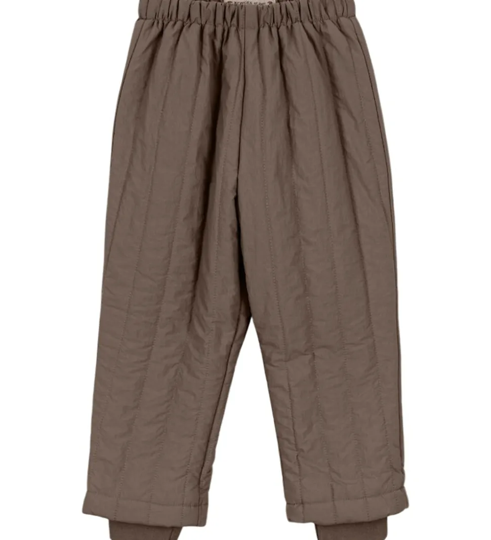 Lækre Konges Sløjd termobukser i quiltet, ensfarvet mørkebrun. Konges Sløjd termobukserne har en god, justerbar elastikkant i livet, og praktiske ribkanter i benåbningerne, der holder vind og kulde ude.