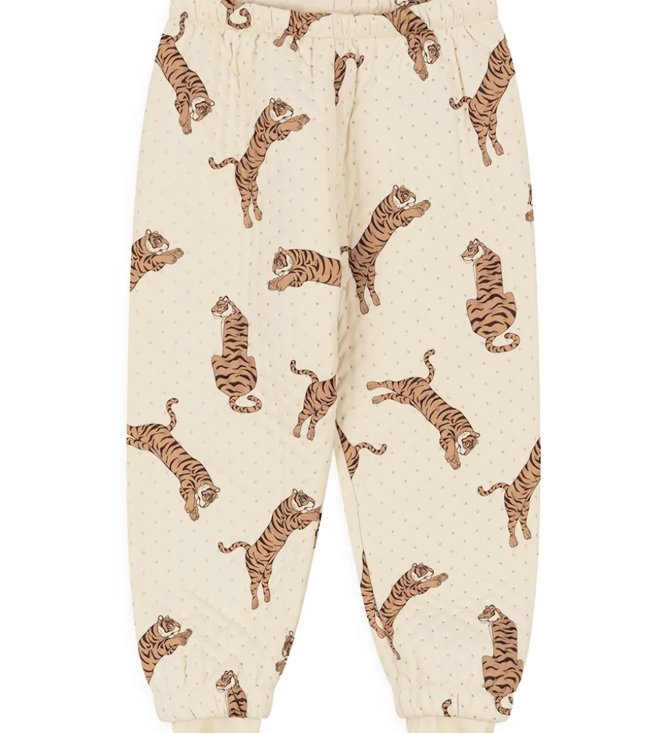 Skønne Konges Sløjd termobukser i beige, med et allover print af tigere.