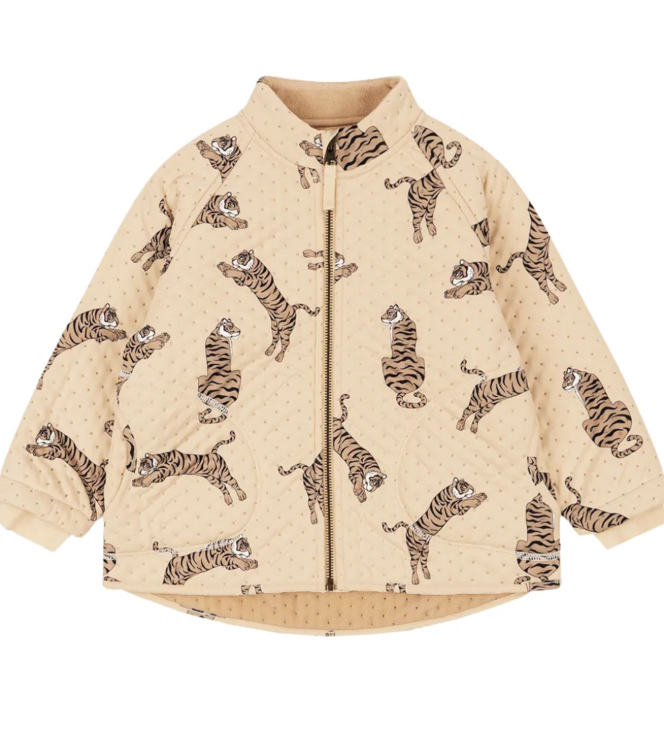 Skøn Konges Sløjd termojakke i beige, med et allover print af tigere.