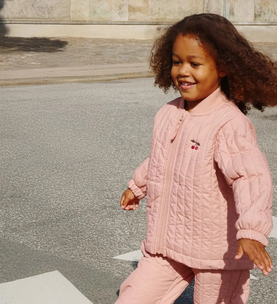 Elegant Konges Sløjd termosæt i en blid, rosa nuance og med gennemgående lodrette syninger, der giver en flot struktur. Termojakken er udstyret med en praktisk lynlås med hagebeskytter og indvendig vindstolpe, og har lange ærmer med elastikkanter. På brystet ses et diskret kirsebærmotiv, der tilføjer et dekorativt element.