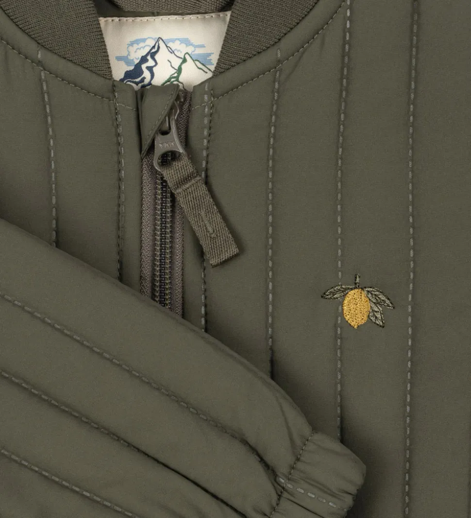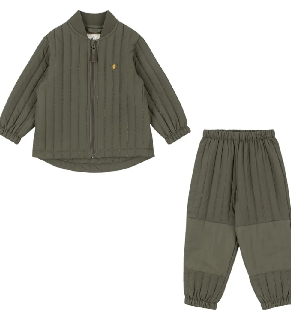 Lækkert Konges Sløjd termosæt i en stilren, olivengrøn nuance med en elegant, vertikal syningsstruktur. Termojakken har en praktisk mellemhøj krave og lukkes med en gennemgående lynlås med hagebeskytter og indvendig vindstolpe. Ærmerne har elastikkanter, som giver en behagelig pasform.