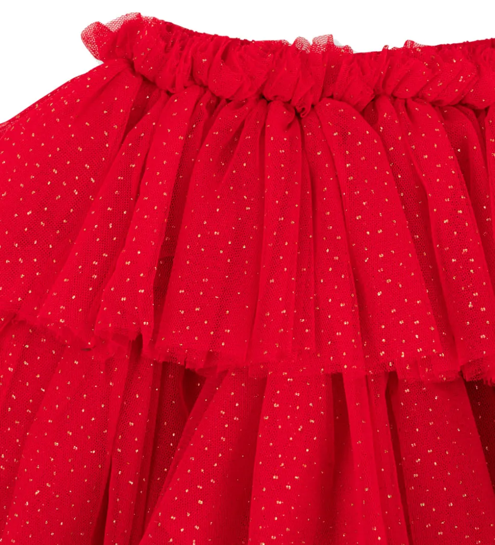 Farverig Konges Sløjd tylnederdel i en livlig rød nuance med flotte lag og glitrende detaljer. Denne nederdel vil tilføje ekstra feststemning til enhver påklædning. På indersiden er der et lag i let, fastvævet bomuld.