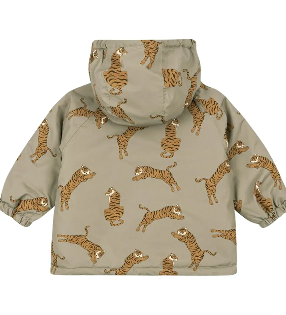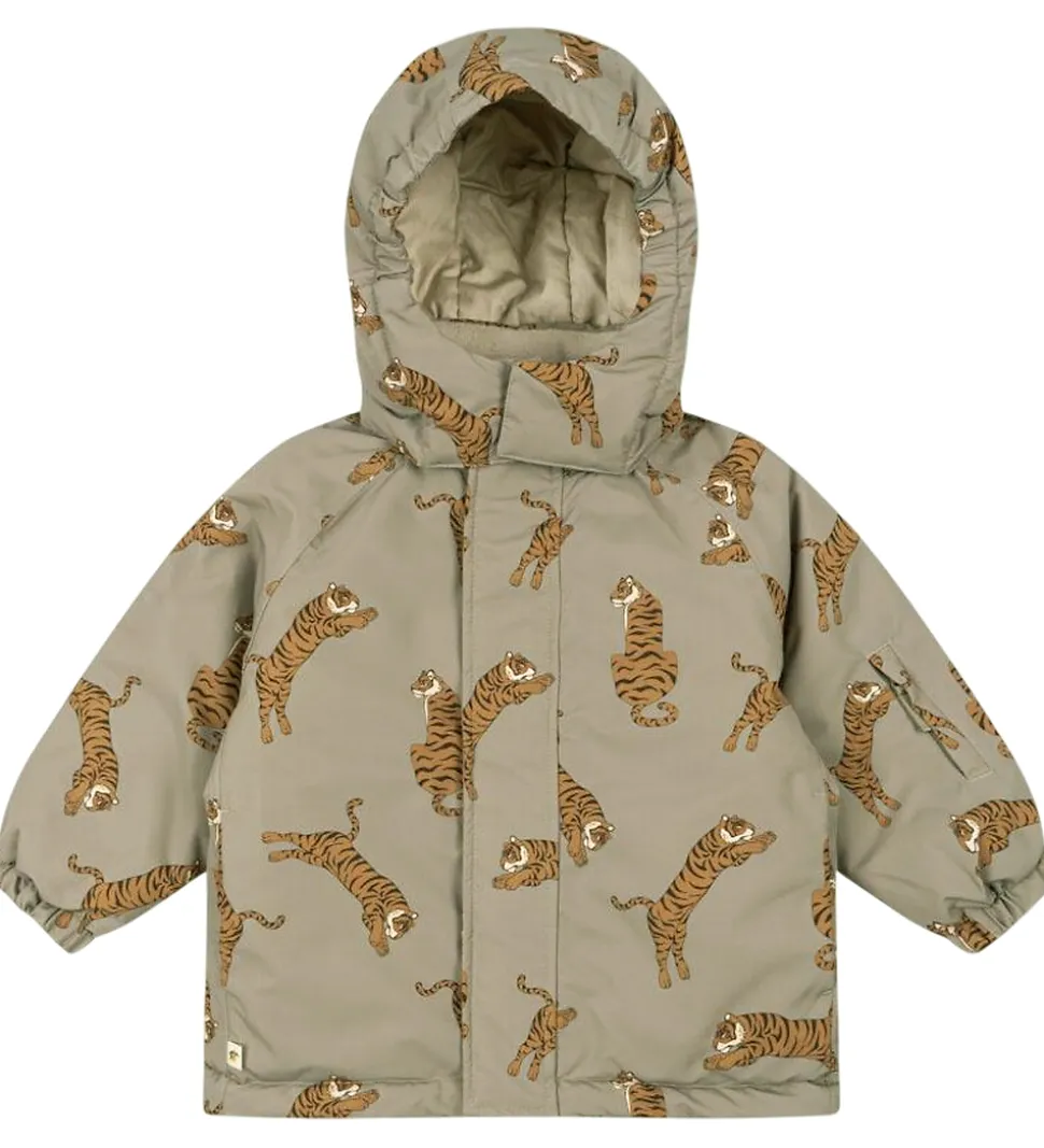 Smart Konges Sløjd vinterjakke i en støvet grøn med et alloverprint af tigere i brune nuancer.