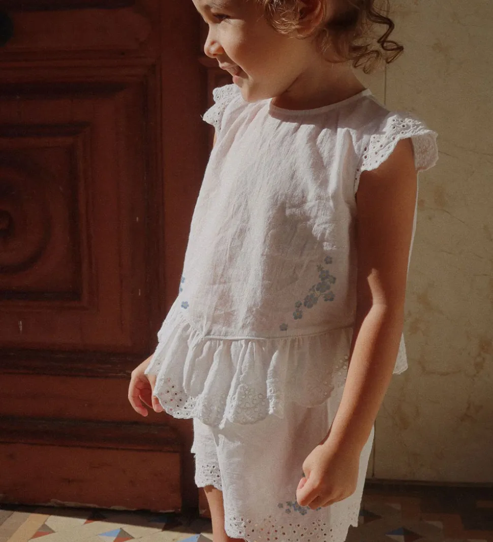 Elegante Konges Sløjd shorts i hvid med fine, blå blomsterdetaljer i venstre side. Shortsene er en kort model med elastisk talje. Nederst er der en flot bølgekant med hulmønster.