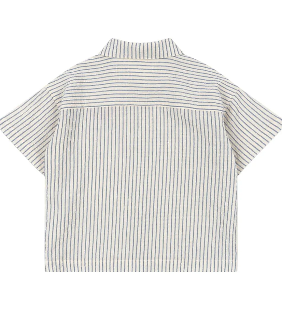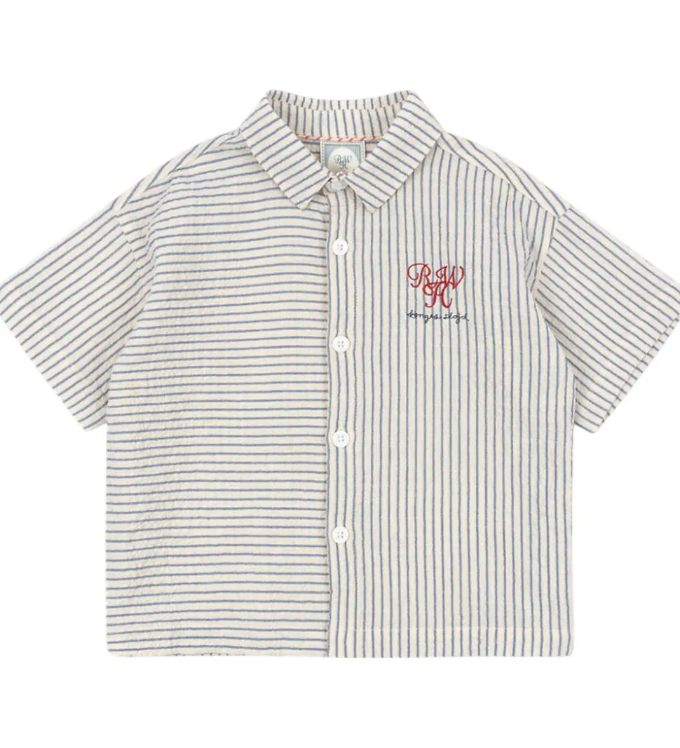 Charmerende skjorte fra Konges Sløjd i råhvid med lodrette striber i blå med en flot, let krøllet struktur. På venstre bryst er der et broderet logo i rød. Skjorten har korte ærmer og en klassiske krave. Den lukkes fortil med gennemgående knapper.