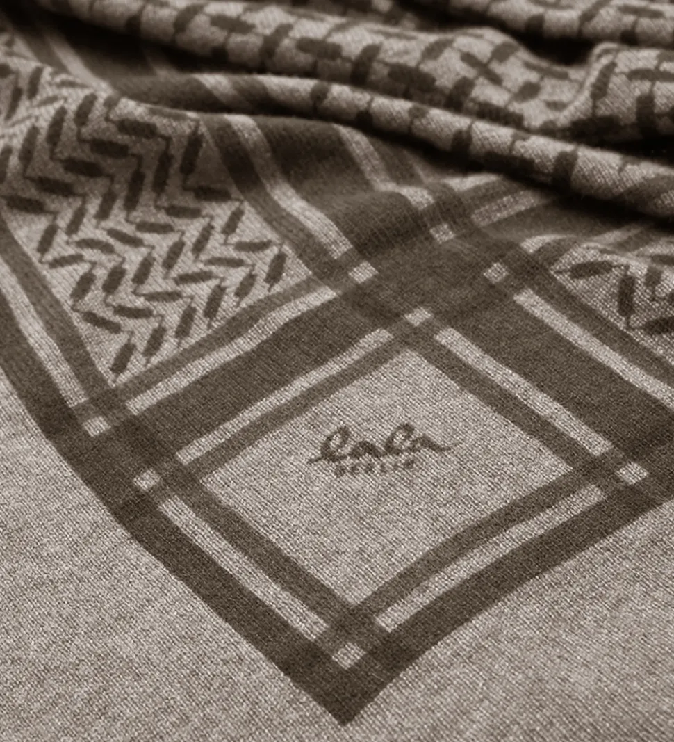 Lækkert Lala Berlin tørklæde i meleret lysebrun med det klassiske Kufiya mønster i mørkebrun.