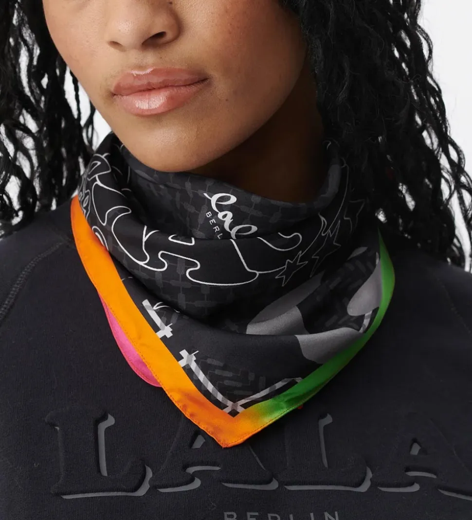 Flot Lala Berlin tørklæde i sort med et diskret Kufiyaprint i grå, og langs kanten har det en farverig stribe i orange, pink, rød og grøn. På midten står der “Lala Berlin Encourage” med hvide bogstaver, der danner en cirkel.