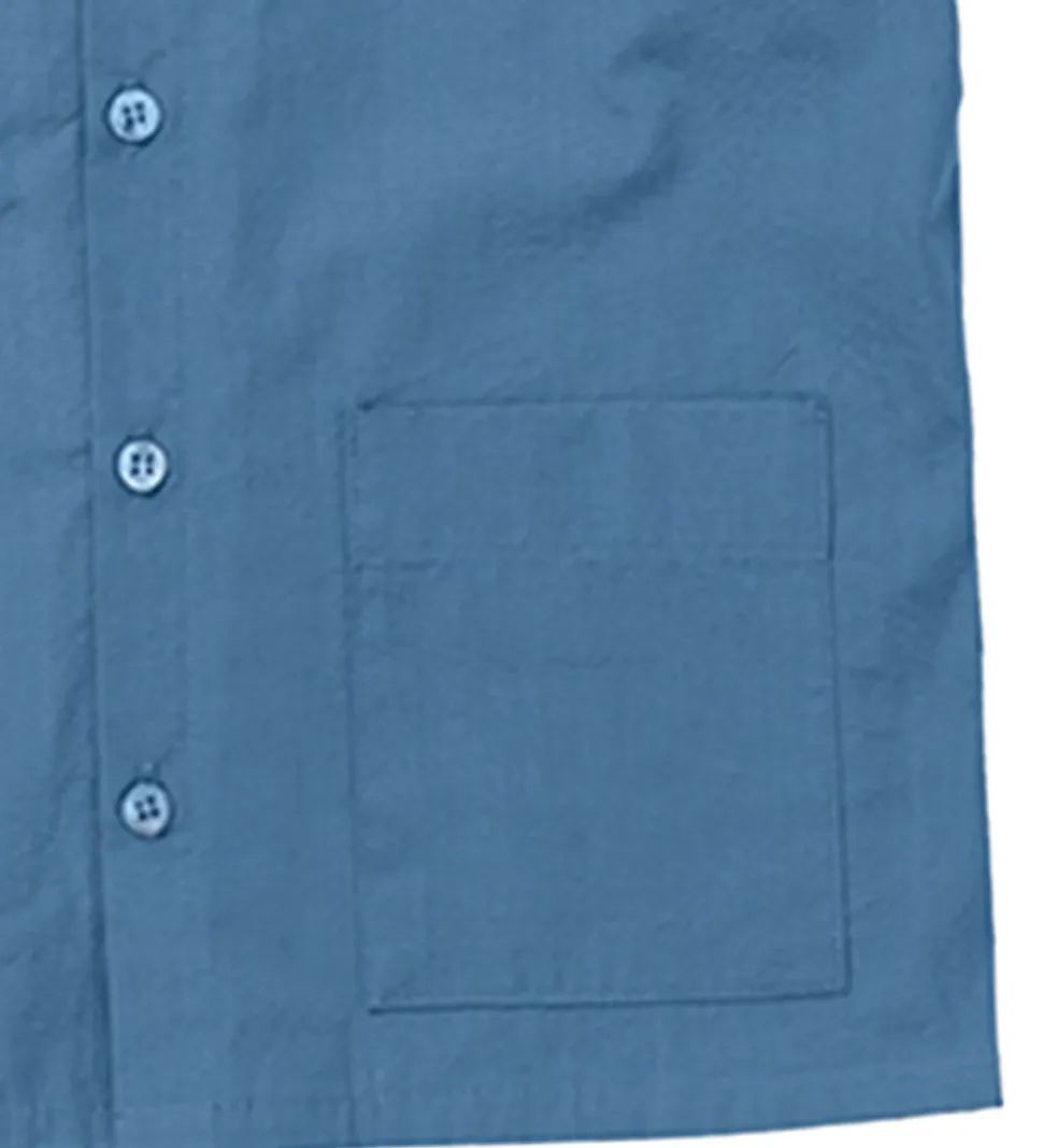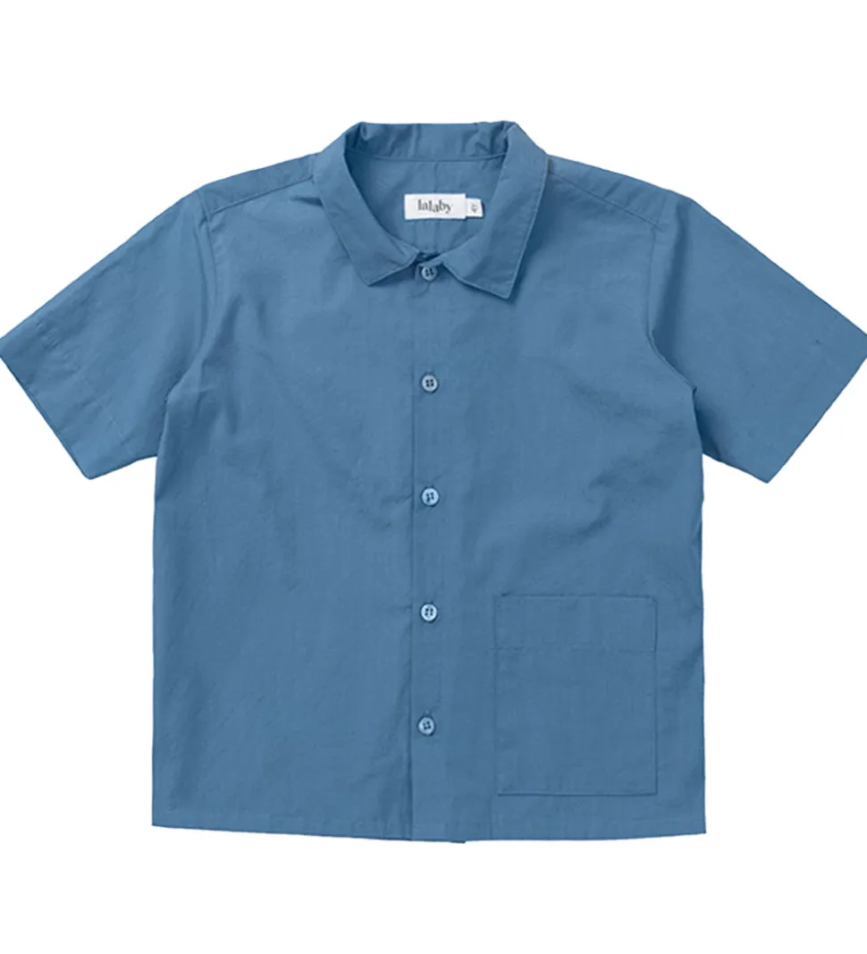 Skøn Lalaby skjorte med korte ærmer i en blød blå farve. Skjorten har en klassisk krave og en praktisk lommesyning på fronten, hvilket gør den til et stilfuldt valg til enhver anledning.