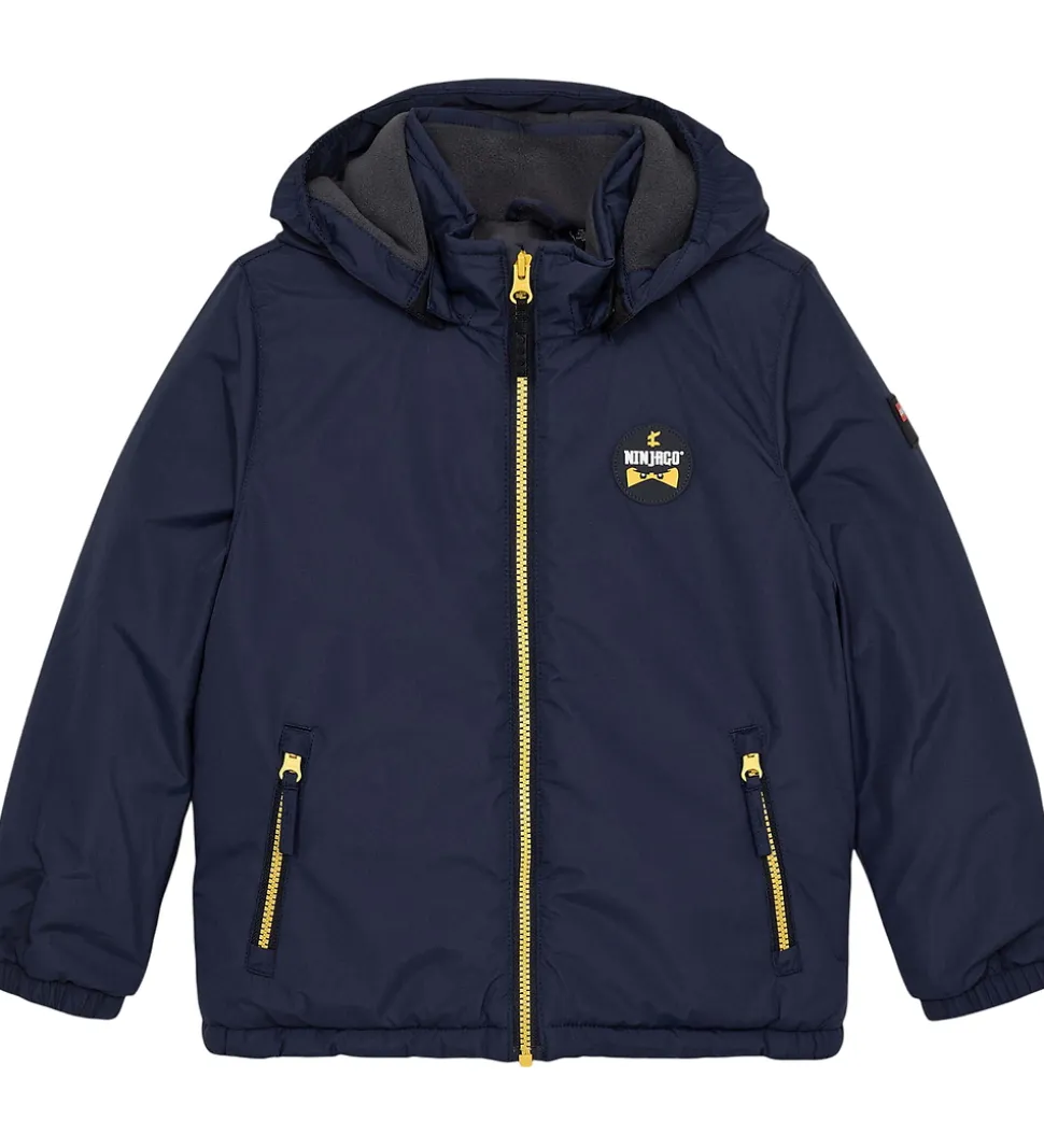 Skøn LEGO® Ninjago vinterjakke i navy med gule lynlåse og en Ninjago-gummiapplikation på venstre bryst.