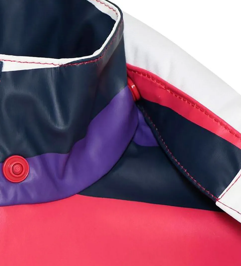 LEGO® Wear regnjakken har en aftagelig hætte, der sidder fast med fuchsiafarvede trykknapper, og ærmerne og bunden af regnjakken har elastikkanter.