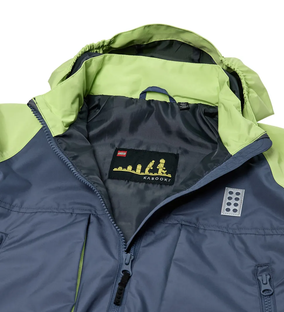 Fin LEGO® Wear sommerjakke i mørk, støvet blå og lysegrøn. Foran i højre side og nederst på ryggen sidder der en logorefleks.