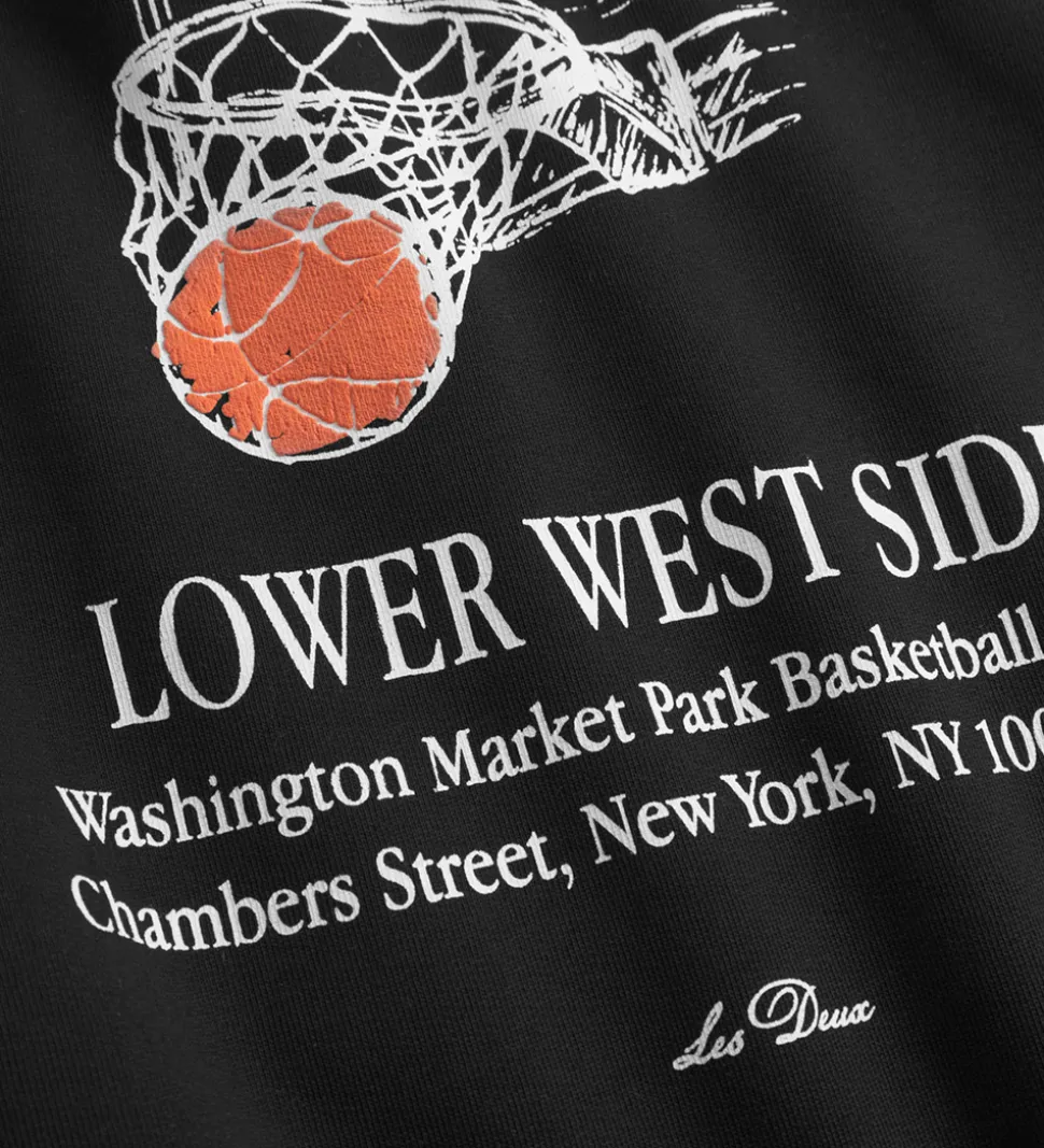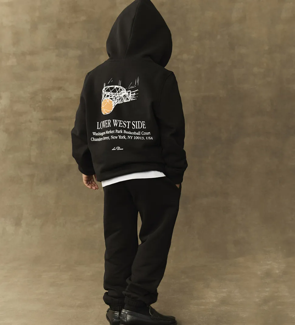 Stilren Les Deux hættetrøje i sort med et diskret logoprint på brystet i hvid, og med et stort tekstprint på bagsiden.