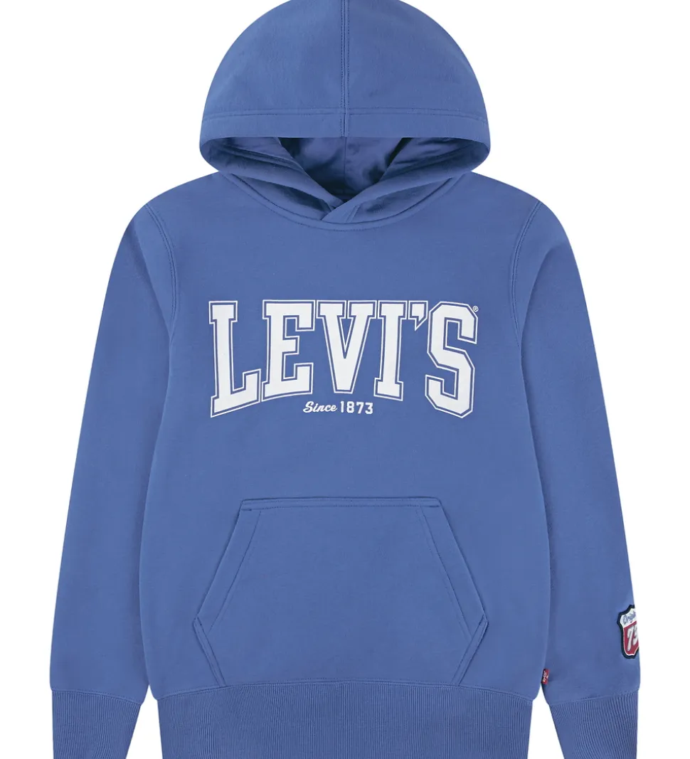 Elegant Levis hættetrøje i en fin, blå farve med et klassisk, hvidt logoprint på fronten. Hættetrøjen har en praktisk kængurulomme på maven. Levis hættetrøje er designet med ribkanter ved håndleddene og i bunden, hvilket sikrer en god pasform.