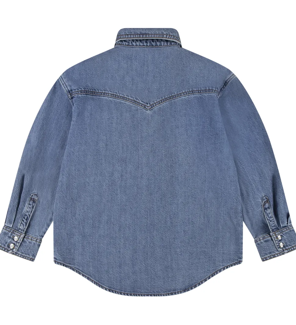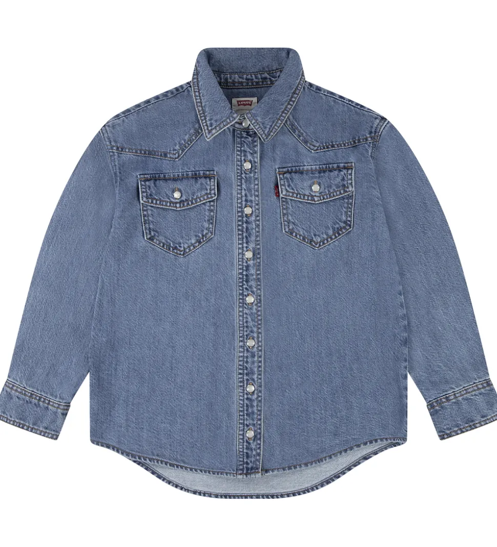 Klassisk Levis skjorte i blå denim med brune syninger og hvide knapper. Skjorten har en klasssisk krave og to brystlommer. Den lukkes fortil med gennemgående knapper.