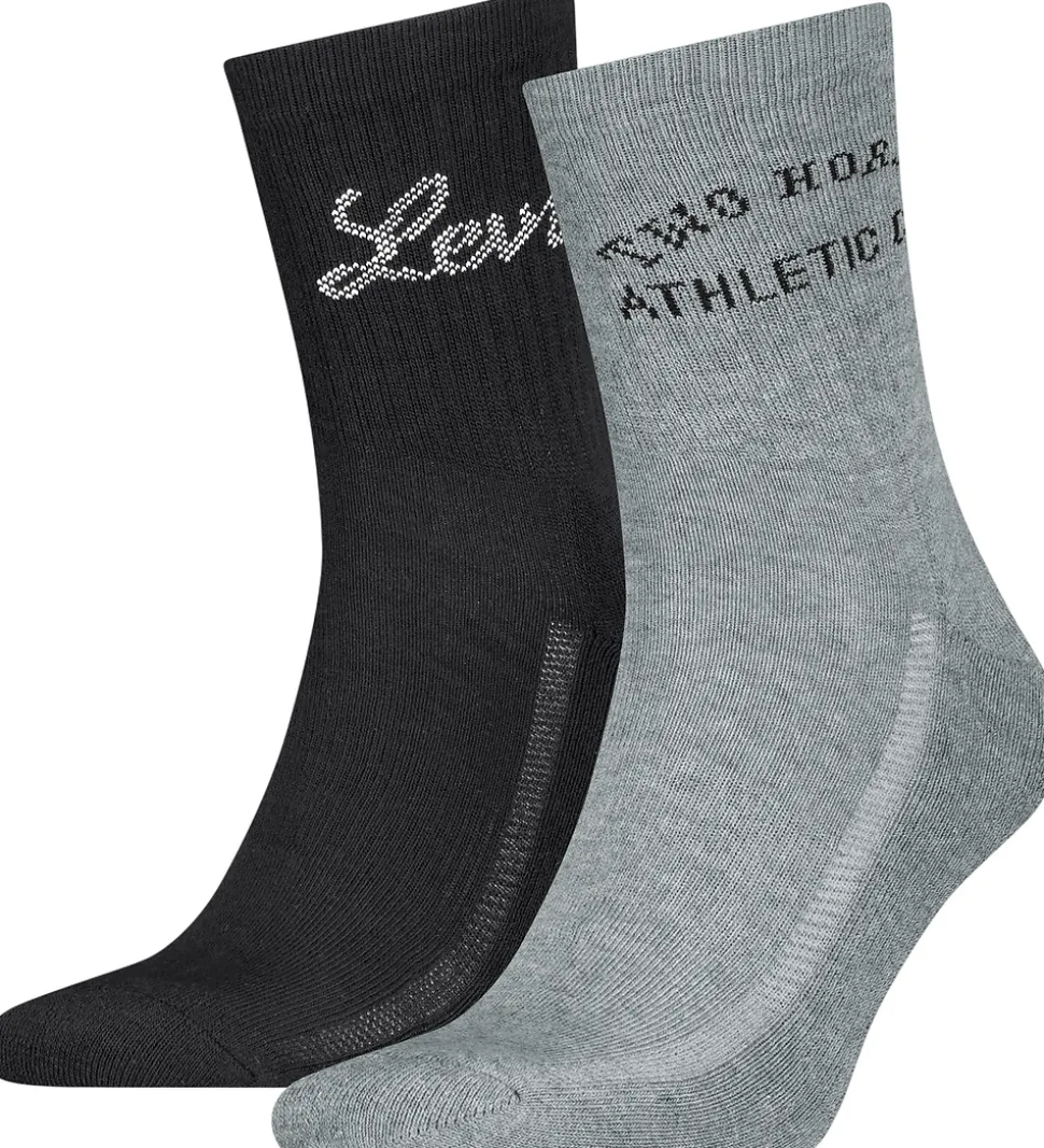 Lækre Levis strømper solgt i en 2-pak. Det ene par er sort med navnet “Levis” i grå på siderne af skaftet, og det andet par er gråmeleret med et sort tekstprint på siderne af skaftet. Strømperne har ribstruktur på skaftet som tennisstrømper, og forstærket hæl og tå og blødt frotté på undersiden af fødderne.