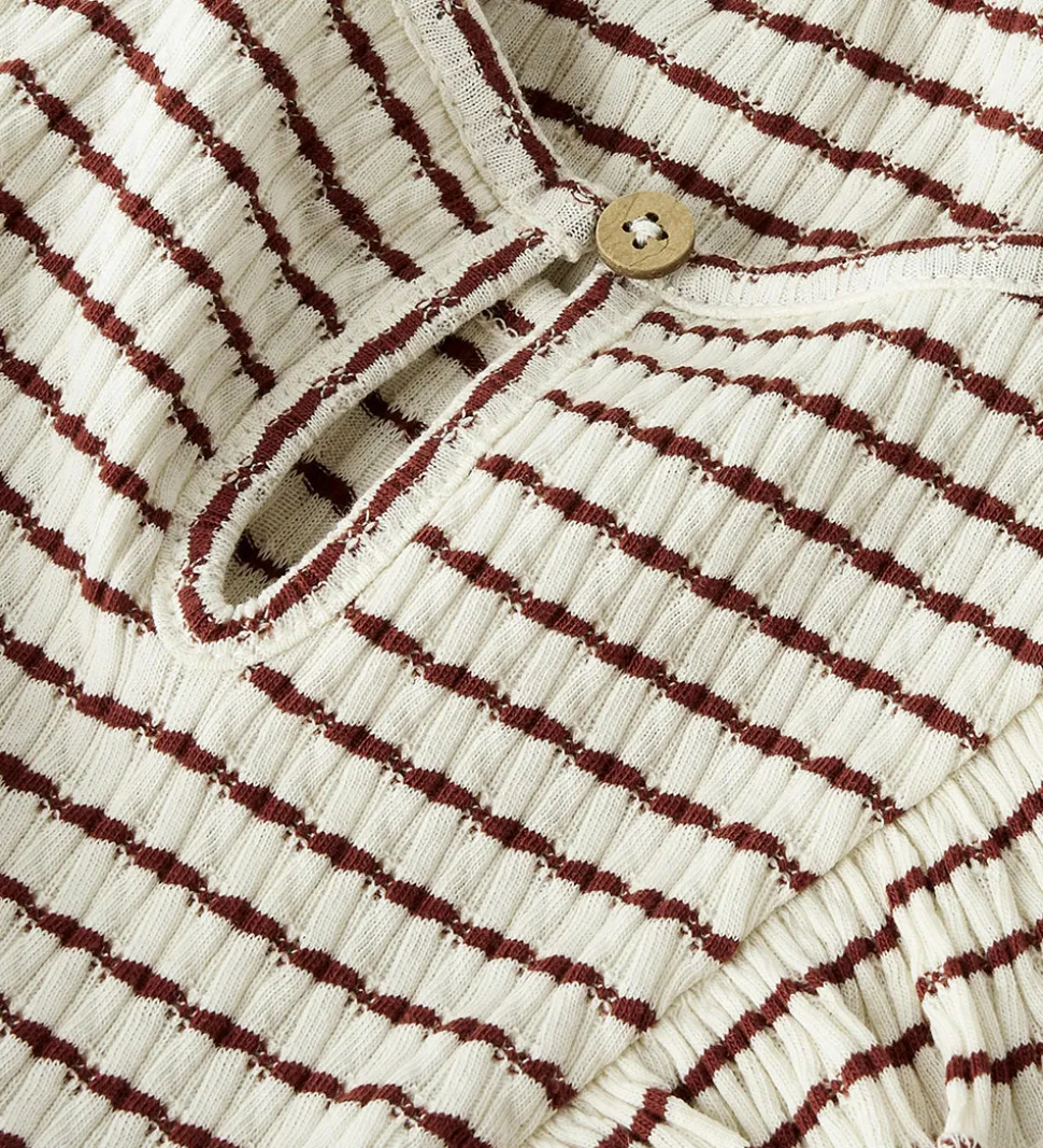 Smagfuld Lil’ Atelier kjole i cremehvid med horisontale, rødbrune striber. Lil’ Atelier kjolen har lange ærmer og charmerende flæsedetaljer ved skuldrene. Strukturen er let ribbet, hvilket giver en fin tekstur.