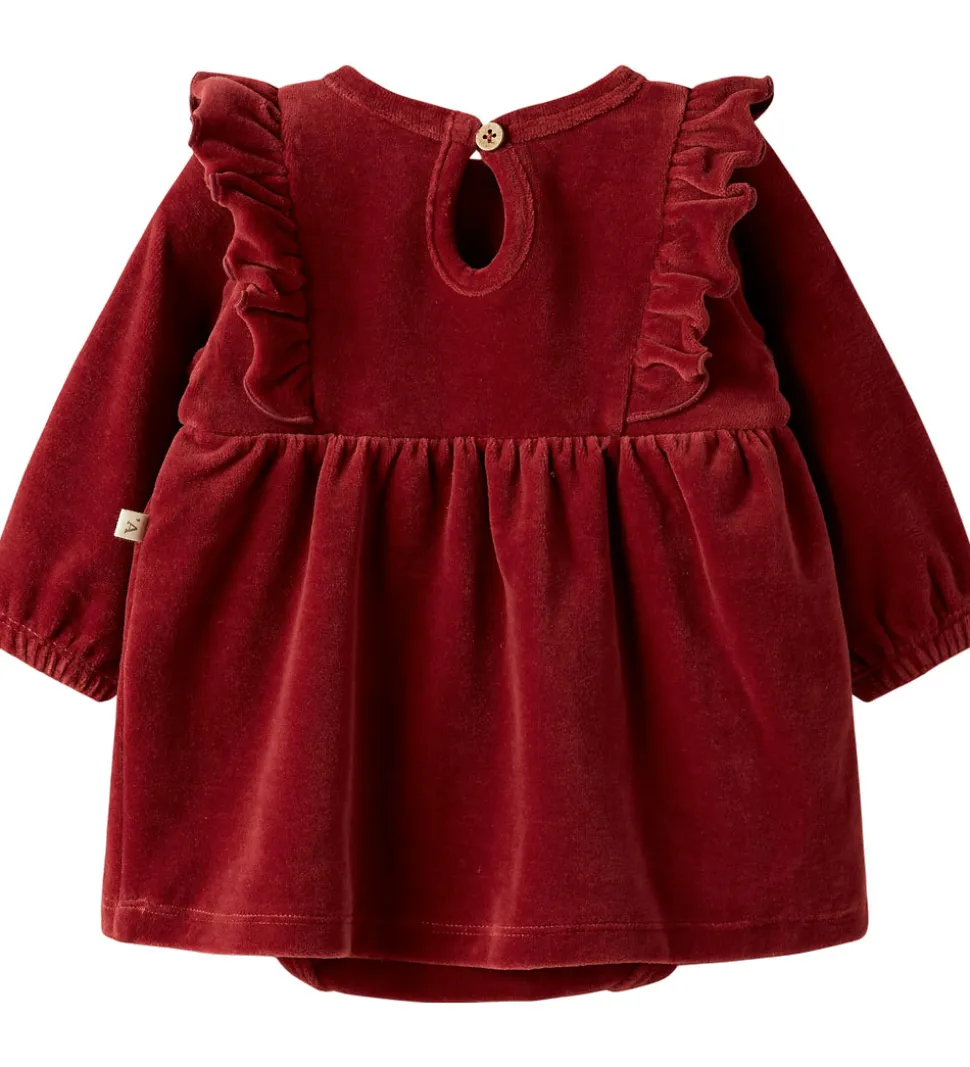 Elegant Lil’ Atelier kjolebody i dyb rød velour. Lil’ Atelier kjolebodyen har lange ærmer og fine flæsedetaljer ved skuldrene. Kjolebodyen har en let rynket nederdel for et klassisk udtryk, og den åbnes i nakken med en knap samt mellem benene med trykknapper.