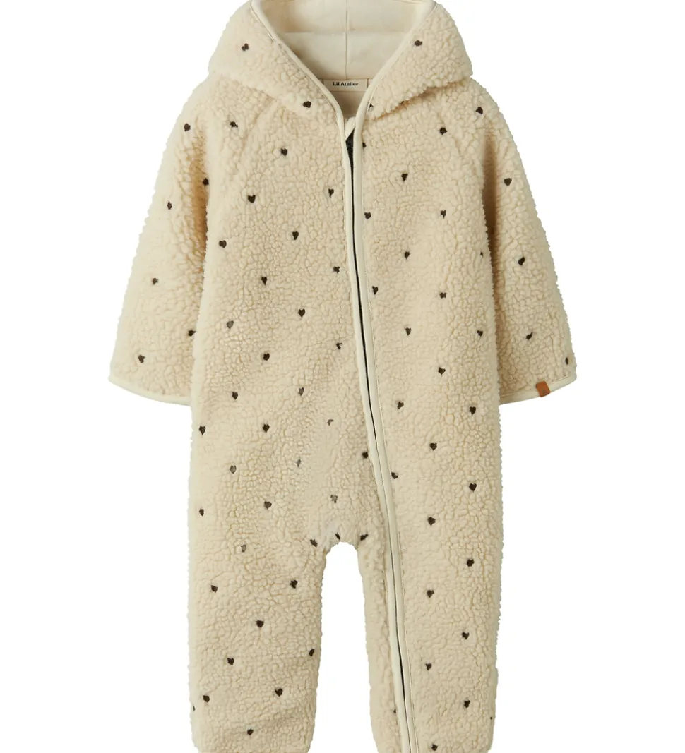 Hyggelig Lil’ Atelier køredragt i en blød cremefarve med små fine hjerter fordelt over det hele.